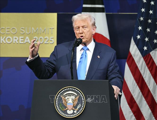 Tổng thống Mỹ Donald Trump phát biểu tại Hội nghị thượng đỉnh doanh nghiệp APEC 2025 ở Gyeongju, Hàn Quốc ngày 29/10/2025. Ảnh: Kyodo/TTXVN