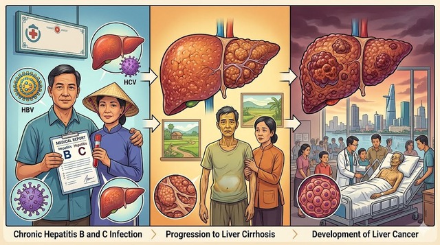 Viêm gan B và C là nguyên nhân chính gây xơ gan và ung thư gan. Virus gây tổn thương tế bào gan kéo dài, làm tăng nguy cơ đột biến tế bào dẫn đến ung thư.