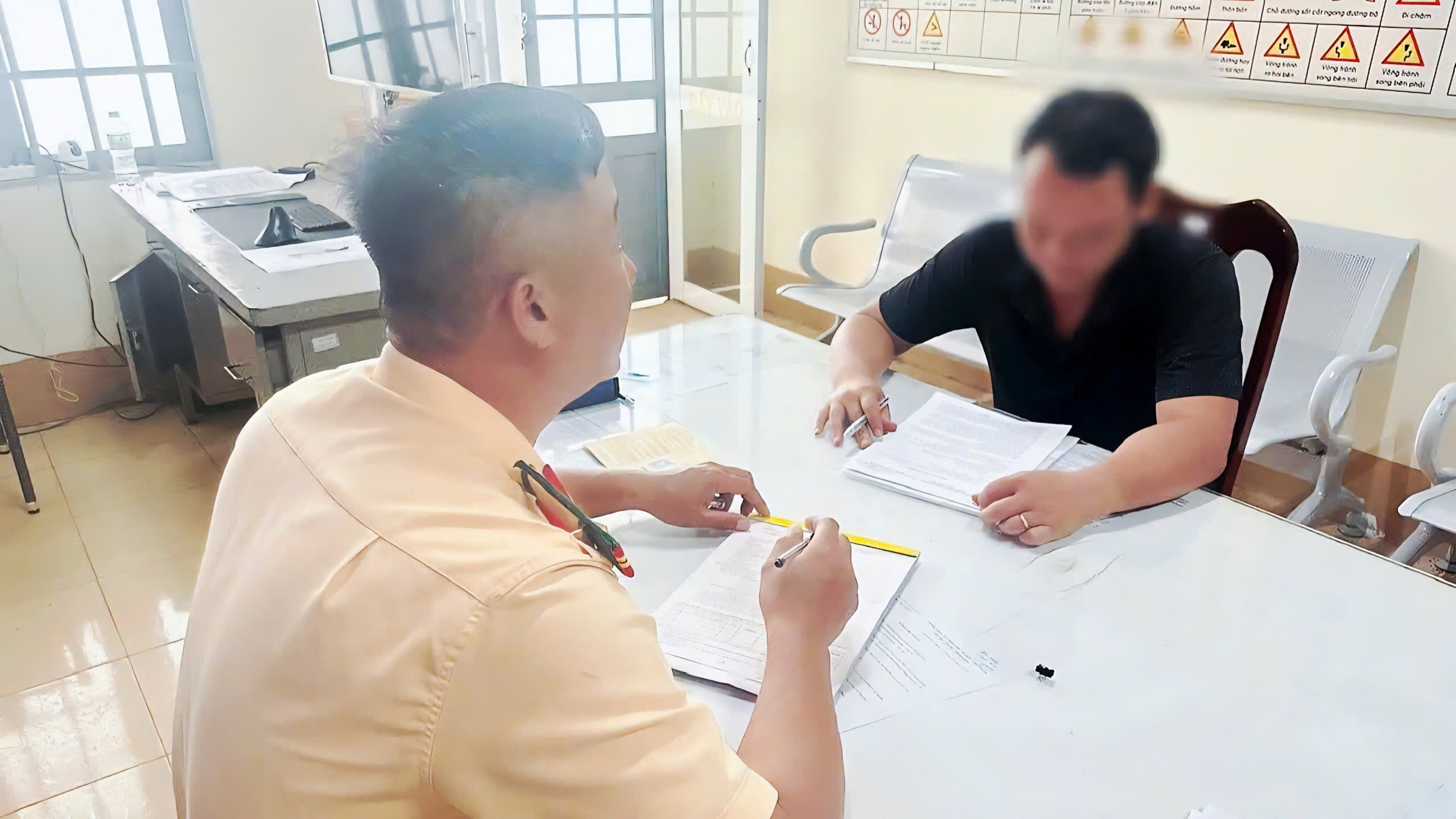 Lực lượng CSGT Suối Tre tiến hành lập biên bản xử phạt đối với tài xế T.V.B.