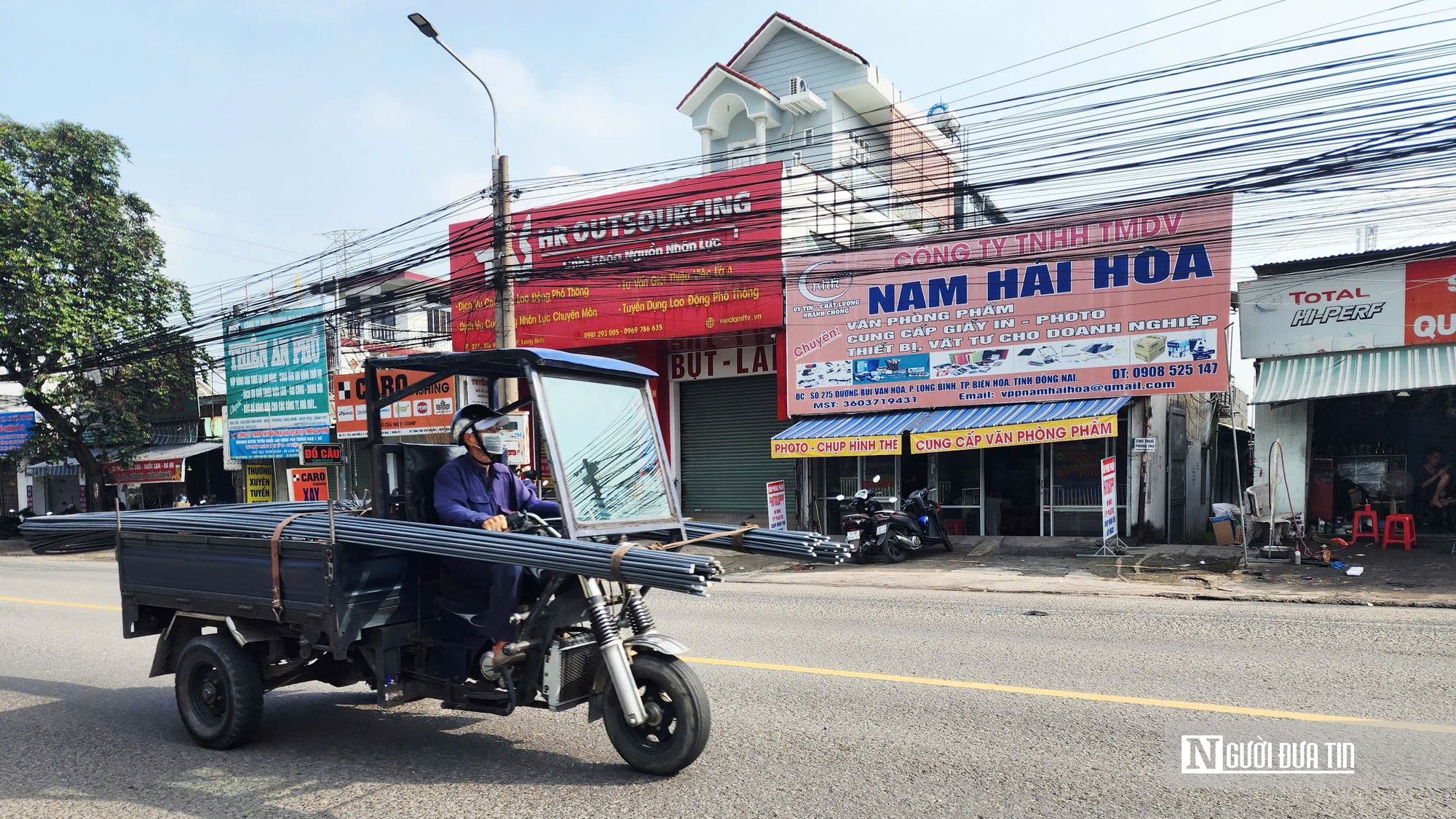 Một chiếc xe ba gác trở sắt xây dựng nhưng không bọc đầu lại gây nguy hiểm cho người tham gia giao thông trên đường Trần Văn Hóa, KP 6, phường Trấn Biên, tỉnh Đồng Nai.
