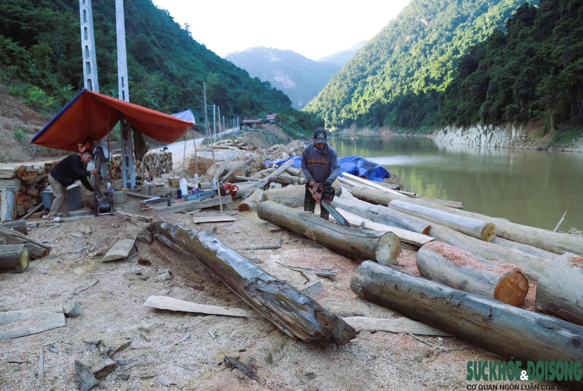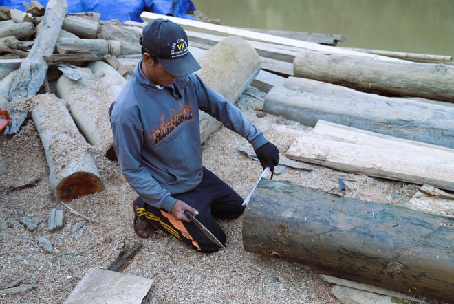 Dù là tự phát, nhưng tại các điểm tập kết, cưa xẻ, sơ chế lượng thân gỗ, khúc gỗ tập trung quy mô như một công trường ngay bên mép sông. Người dân đo đạc, kẻ chỉ và cưa xẻ các thân gỗ tốt để làm cột, ván cho nhà sàn ngay bên mép nước.