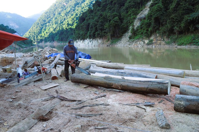 Tại những điểm tập kết gỗ, sơ chế, xẻ gỗ, người dân dựng lều ngay bên bờ sông để kéo gỗ, xẻ gỗ từ sáng sớm đến chiều muộn.