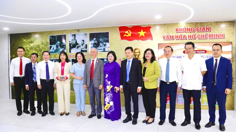 Đại biểu chụp ảnh lưu niệm tại Không gian văn hóa Hồ Chí Minh tại Bệnh viện Từ Dũ.