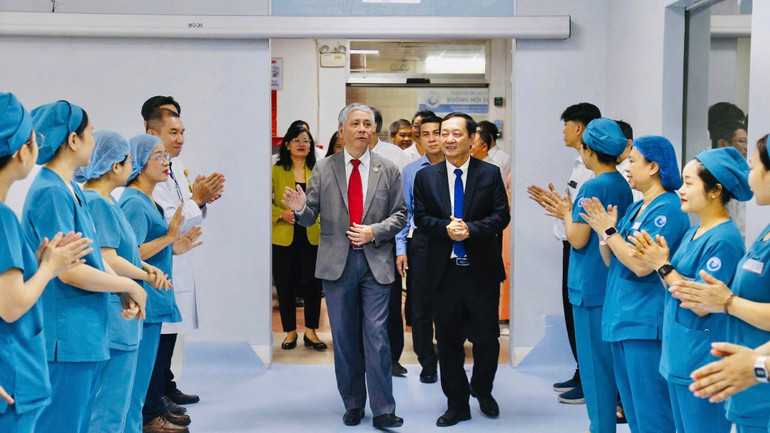 Y bác sĩ tại Bệnh viện Từ Dũ chào mừng công trình y tế mới.