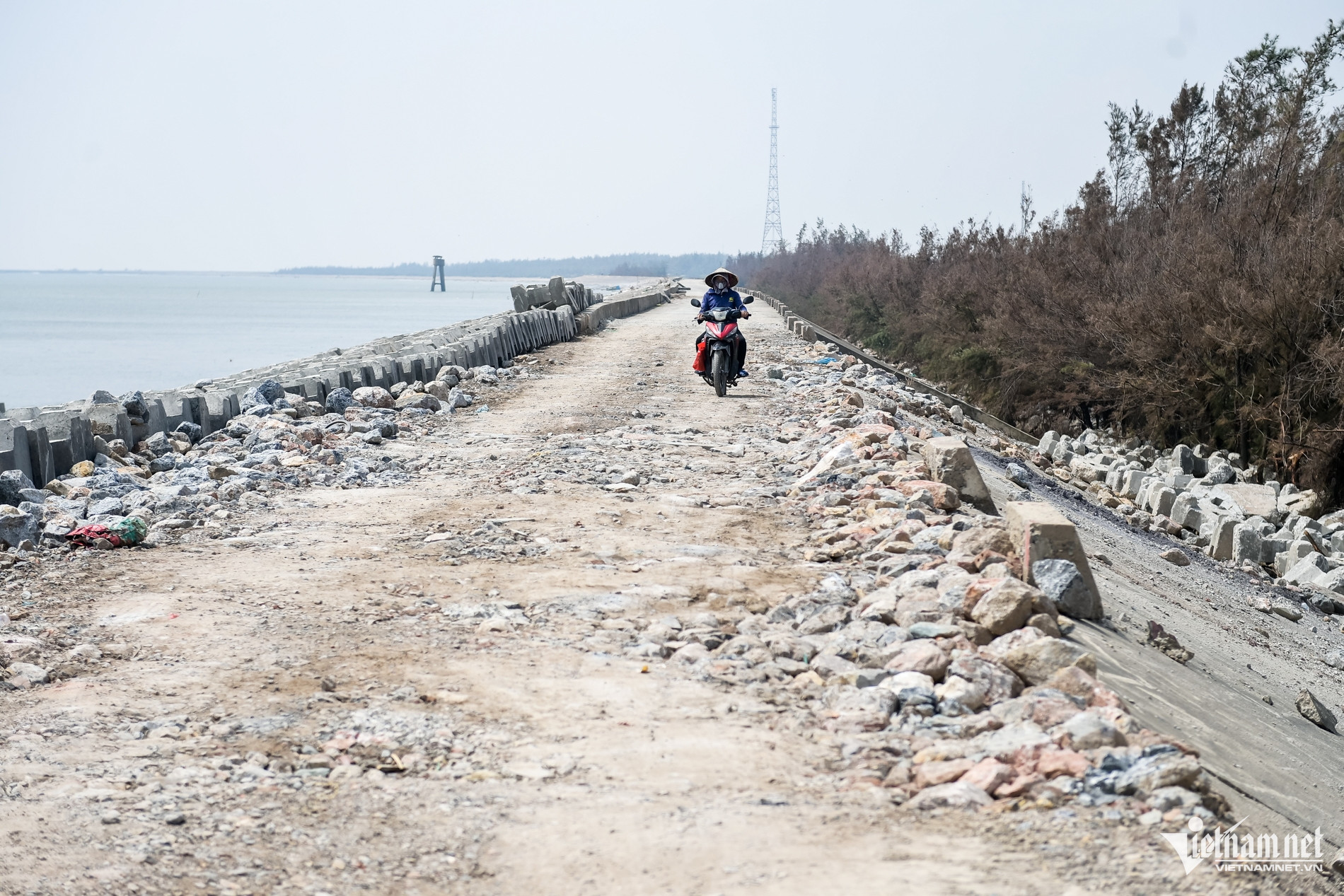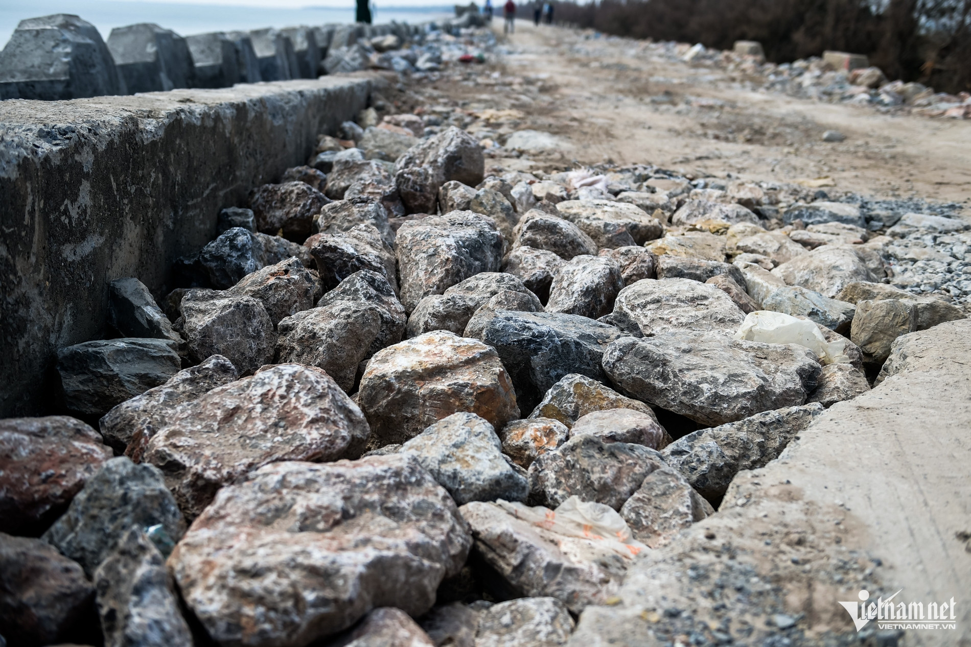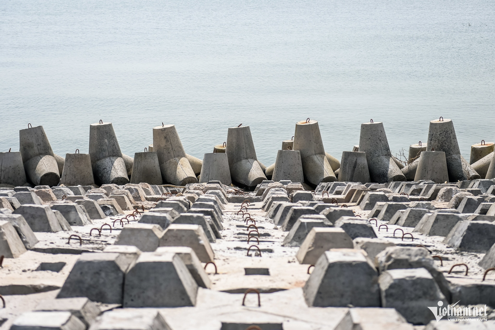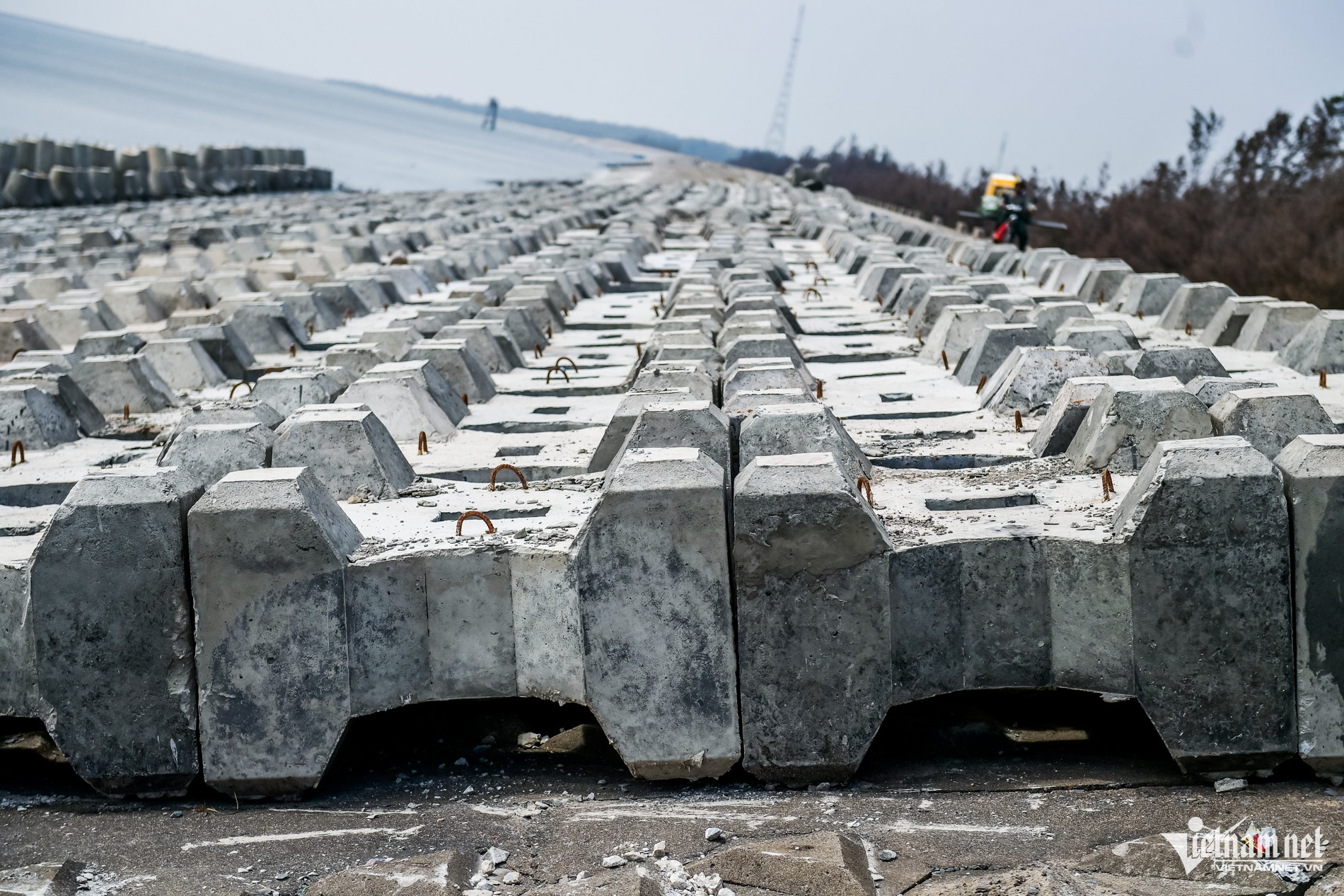 Theo ông Quyết, phần lõi thân đê được gia cố chủ yếu bằng đá hộc. Phần mái đê được lát hơn 1.000 cấu kiện bê tông H, chân đê sử dụng hơn 200 cấu kiện Tetrapod để chắn sóng.