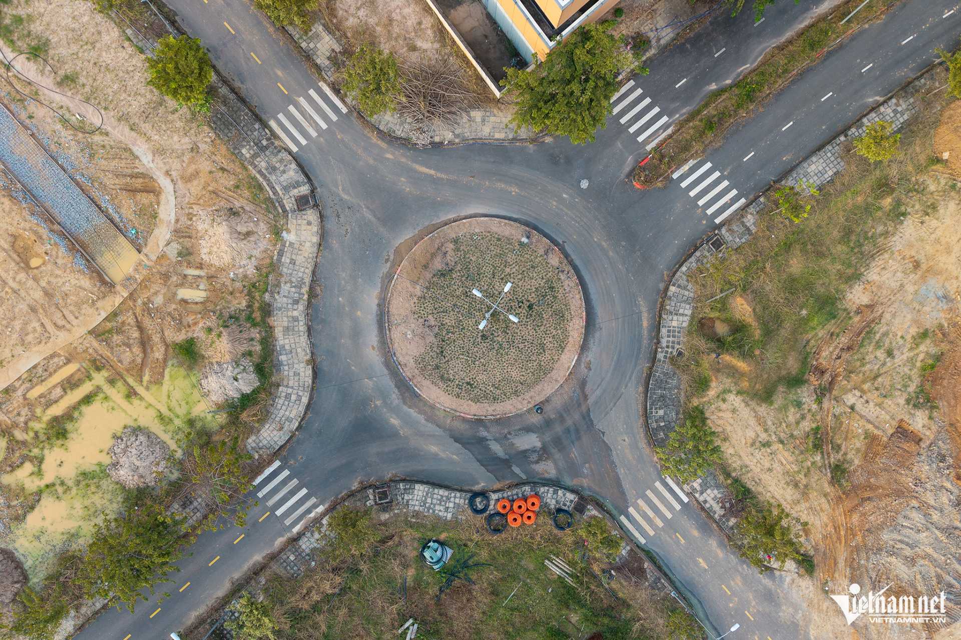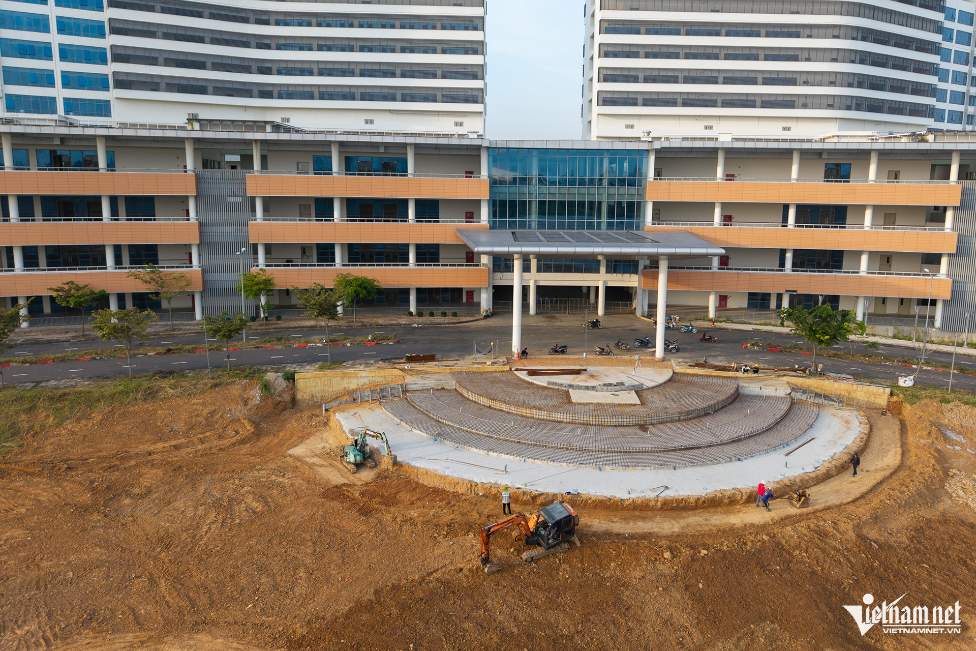 Theo ghi nhận của PV VietNamNet ngày 15/11, công nhân đang gấp rút thi công các hạng mục trước bệnh viện như bãi đậu xe - công viên - cây xanh...