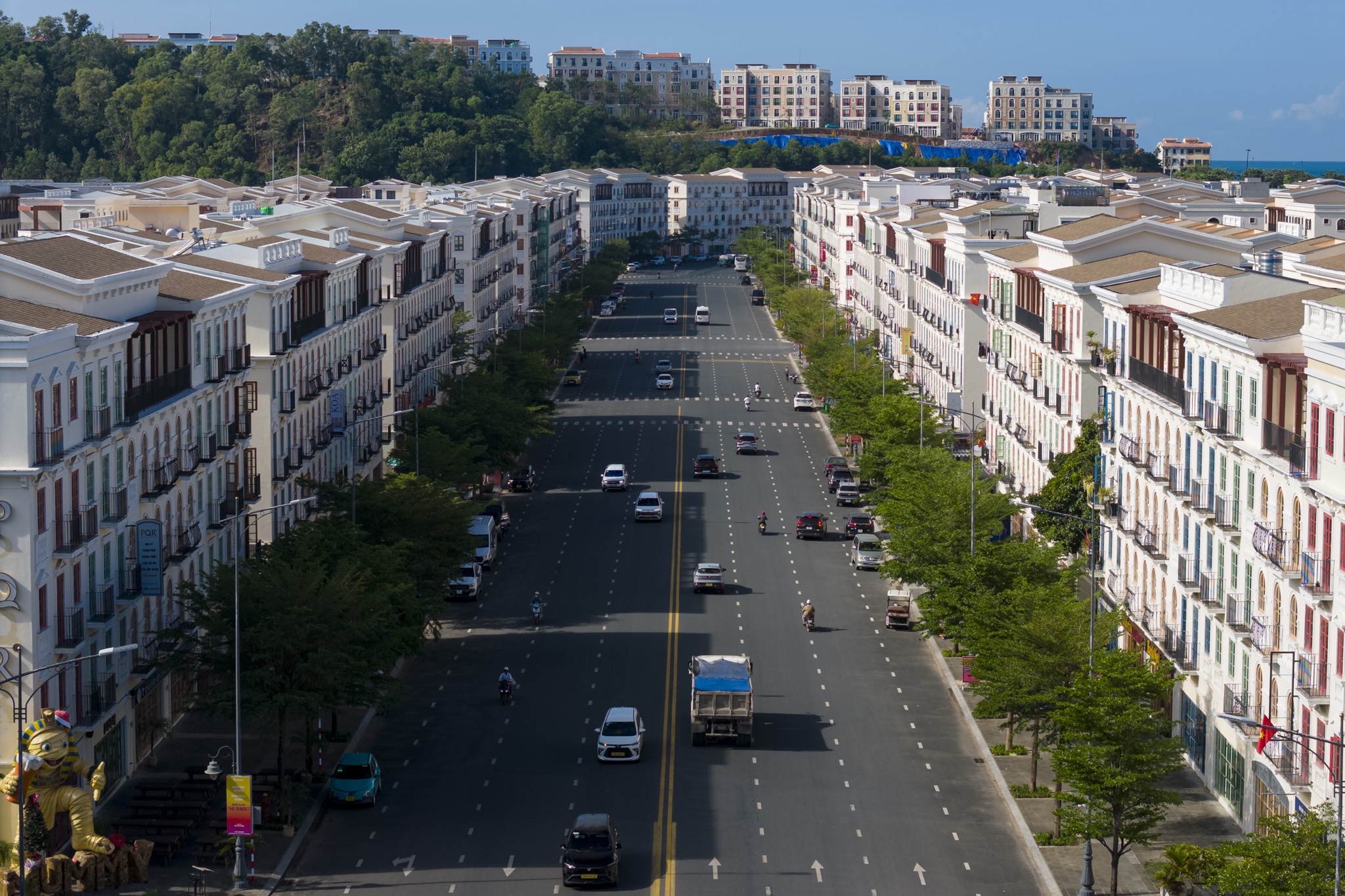 Đoạn ĐT975 qua Thị trấn Hoàng Hôn (Sunset Town) nhìn từ trên cao nổi bật với trục đường 10 làn rộng rãi, dải phân cách xanh mướt và không gian đô thị được quy hoạch đồng bộ, tạo diện mạo khang trang, hiện đại cho khu Nam Phú Quốc.
