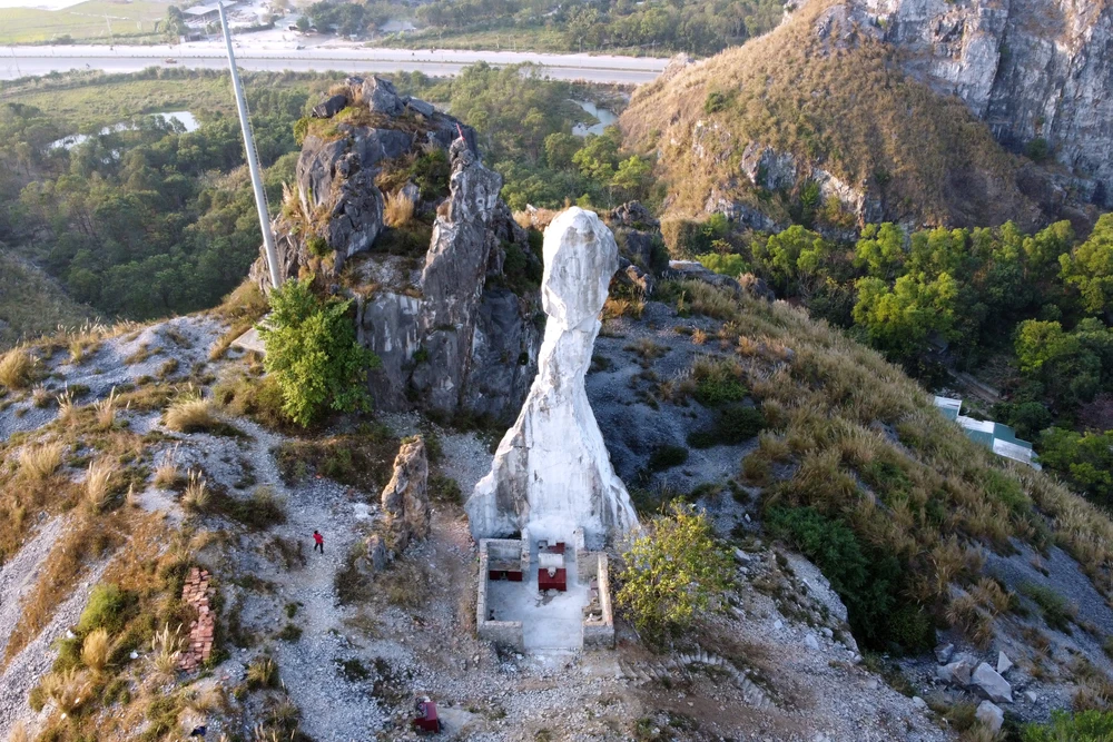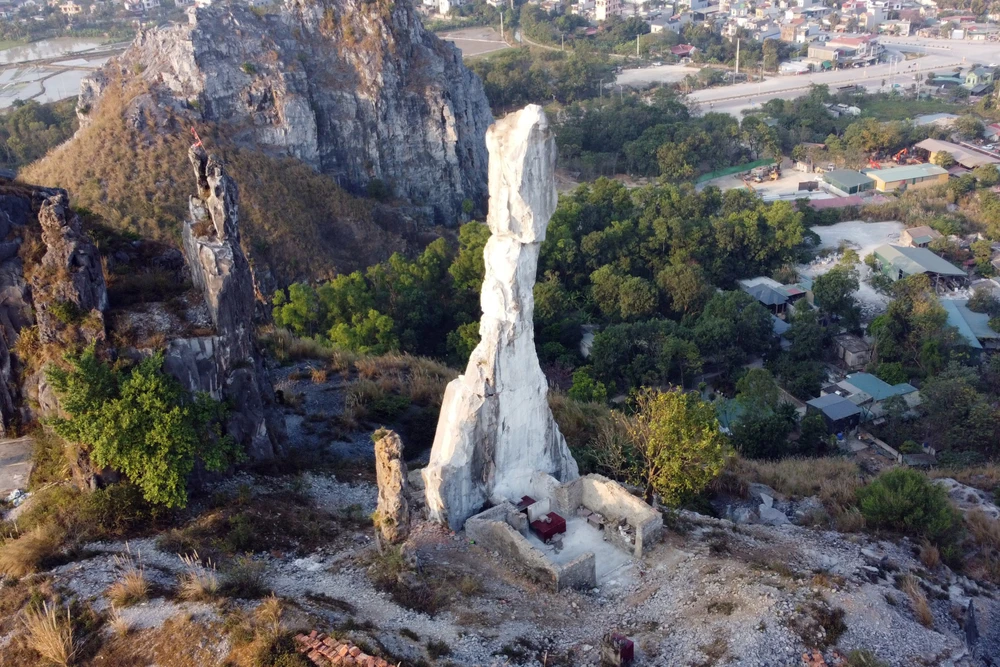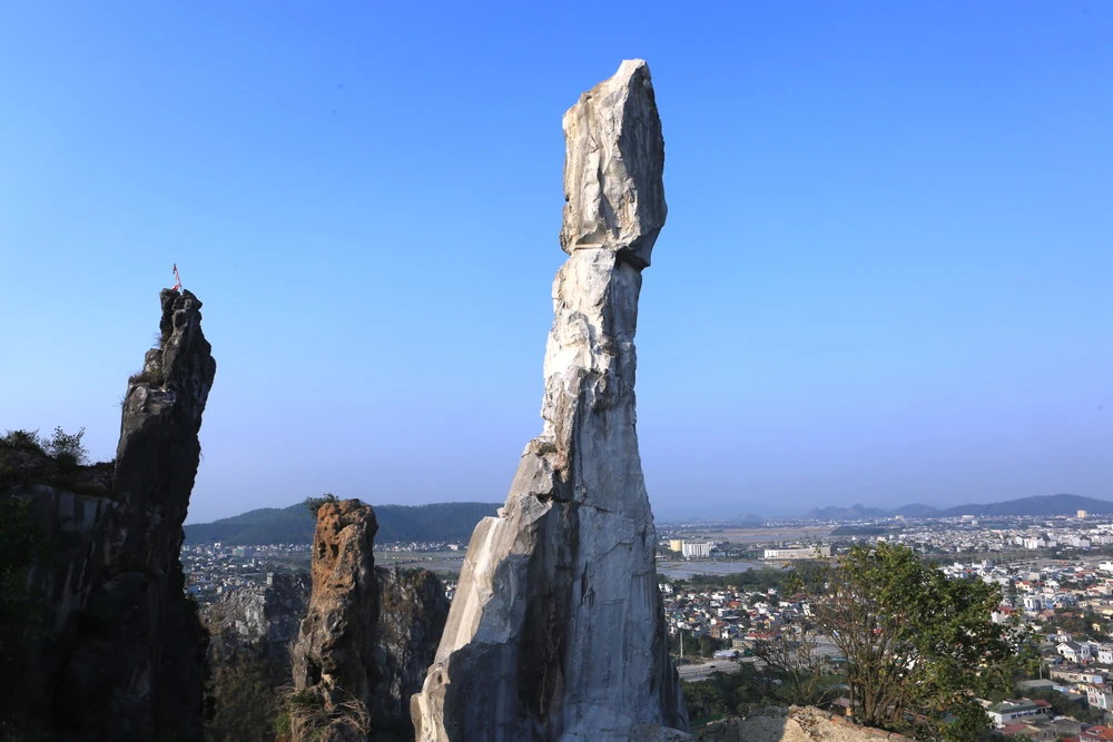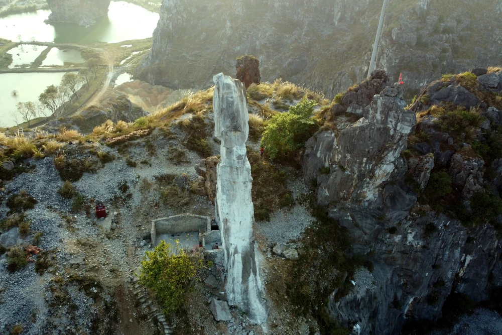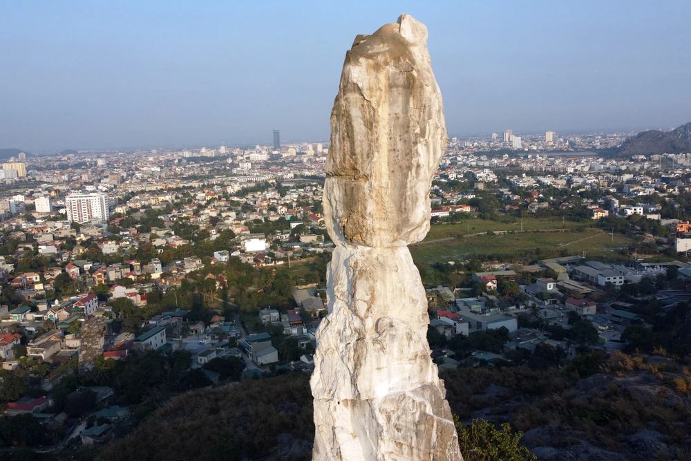 Phần ngọn của hòn Vọng Phu sau quá trình can thiệp kỹ thuật, bề mặt đá ở khu vực đỉnh đã đổi màu rõ rệt so với trạng thái tự nhiên ban đầu.
