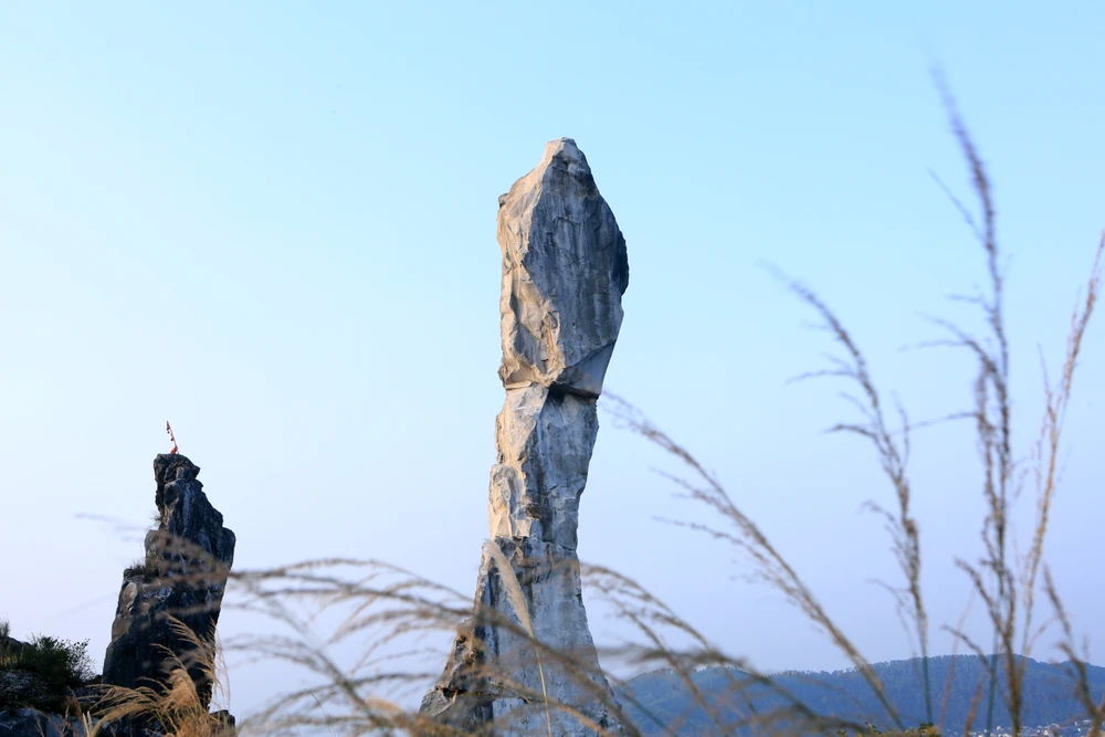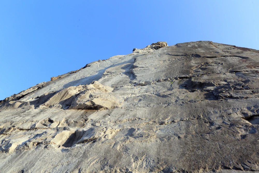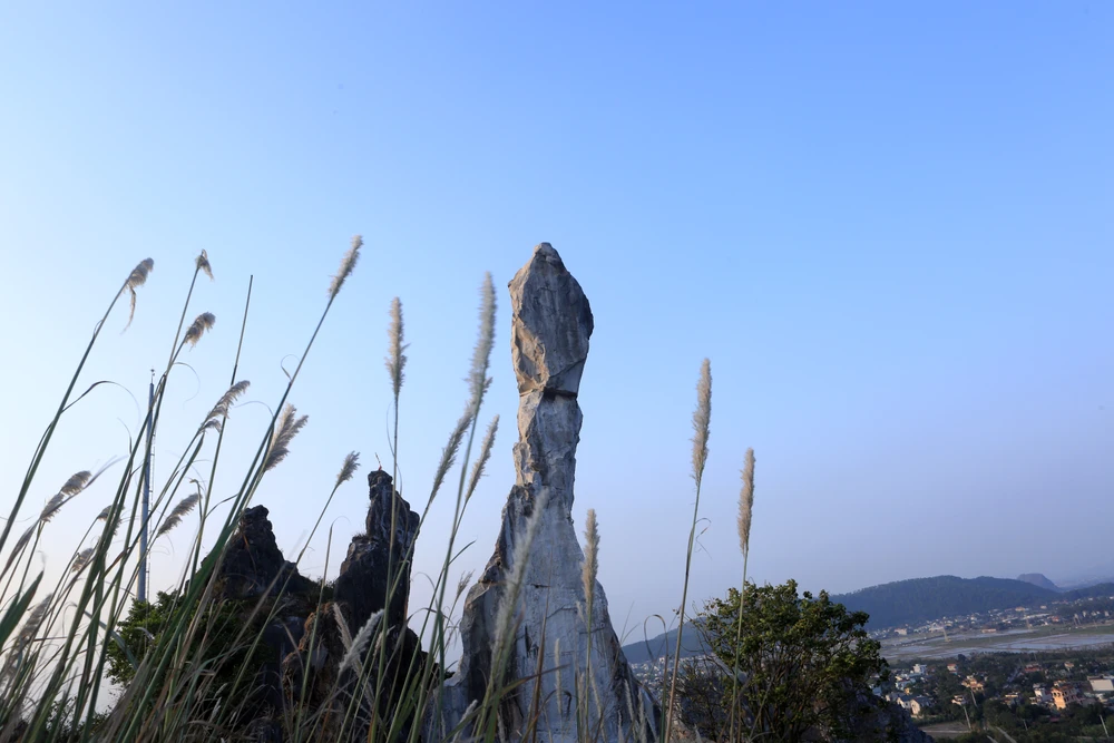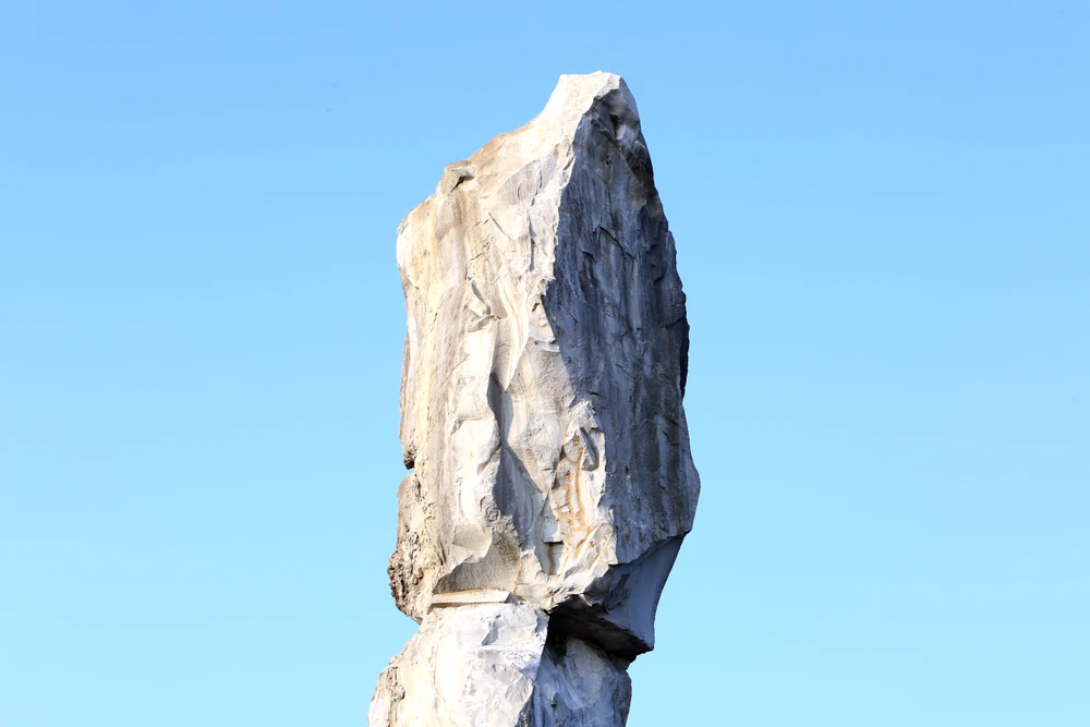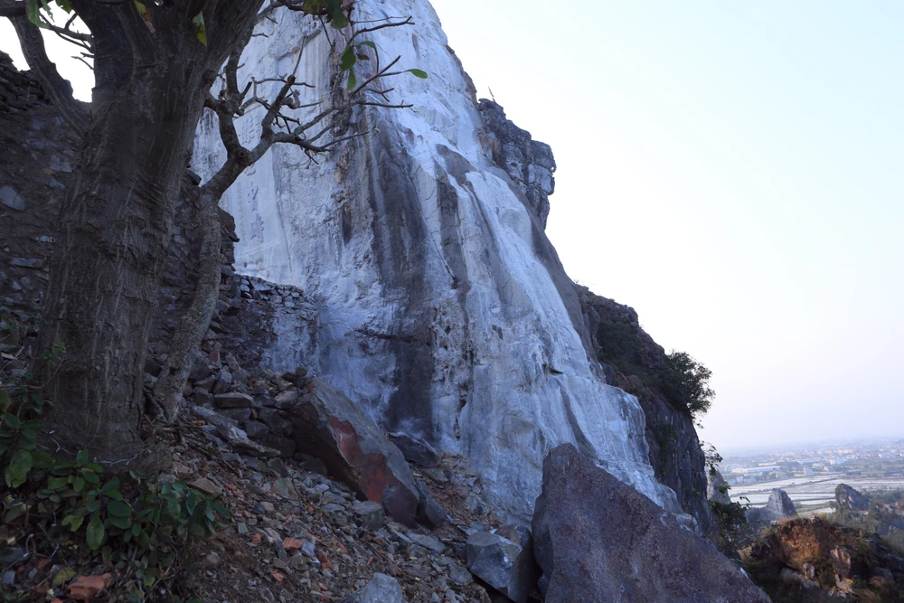 Phần ngọn của hòn Vọng Phu sau quá trình can thiệp kỹ thuật, bề mặt đá ở khu vực đỉnh đã đổi màu rõ rệt so với trạng thái tự nhiên ban đầu.