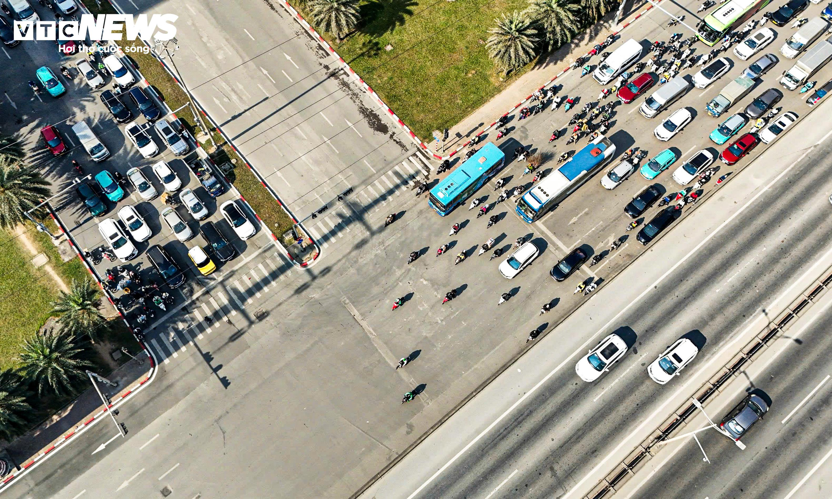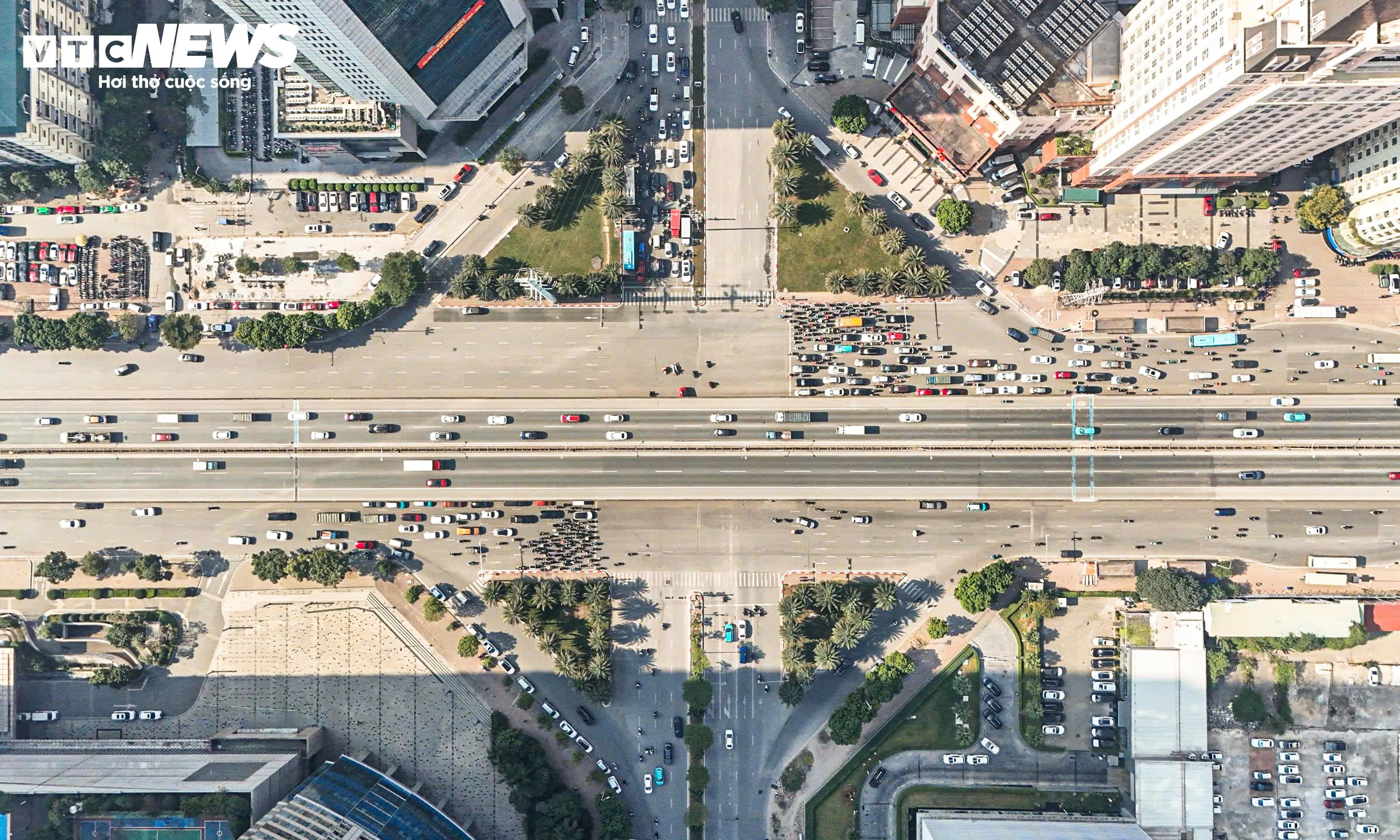 Ngay cả tại thời điểm khoảng 9h30, khi lưu lượng phương tiện đã giảm so với cao điểm buổi sáng, nhiều ô tô vẫn nối đuôi nhau qua khu vực nút giao.