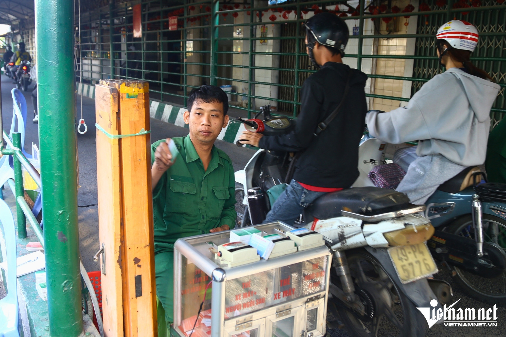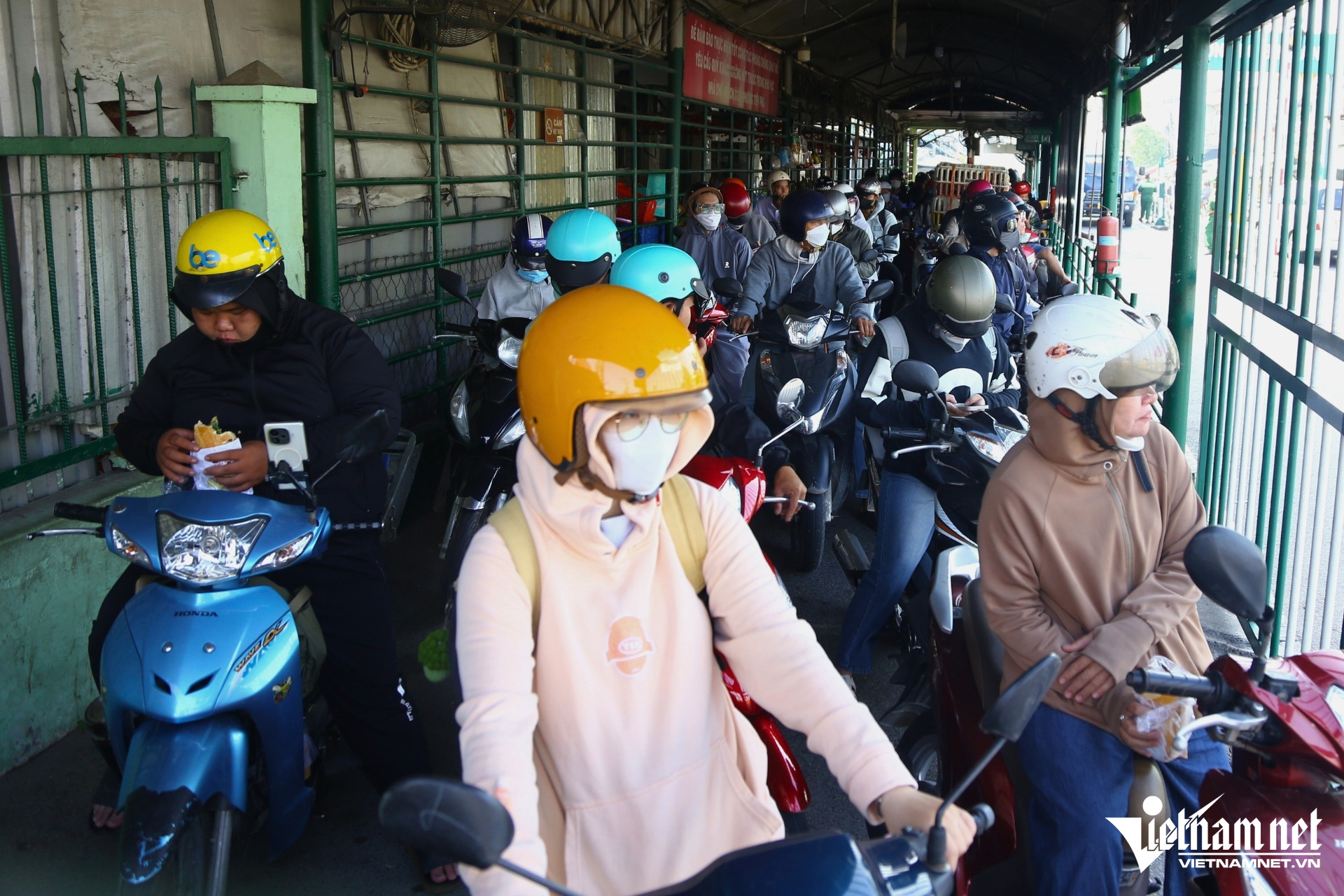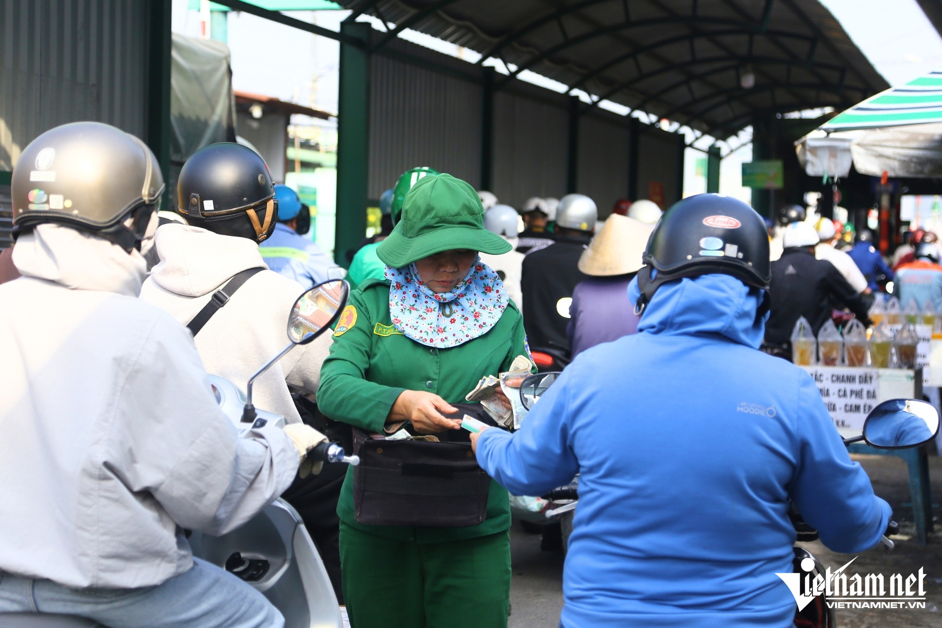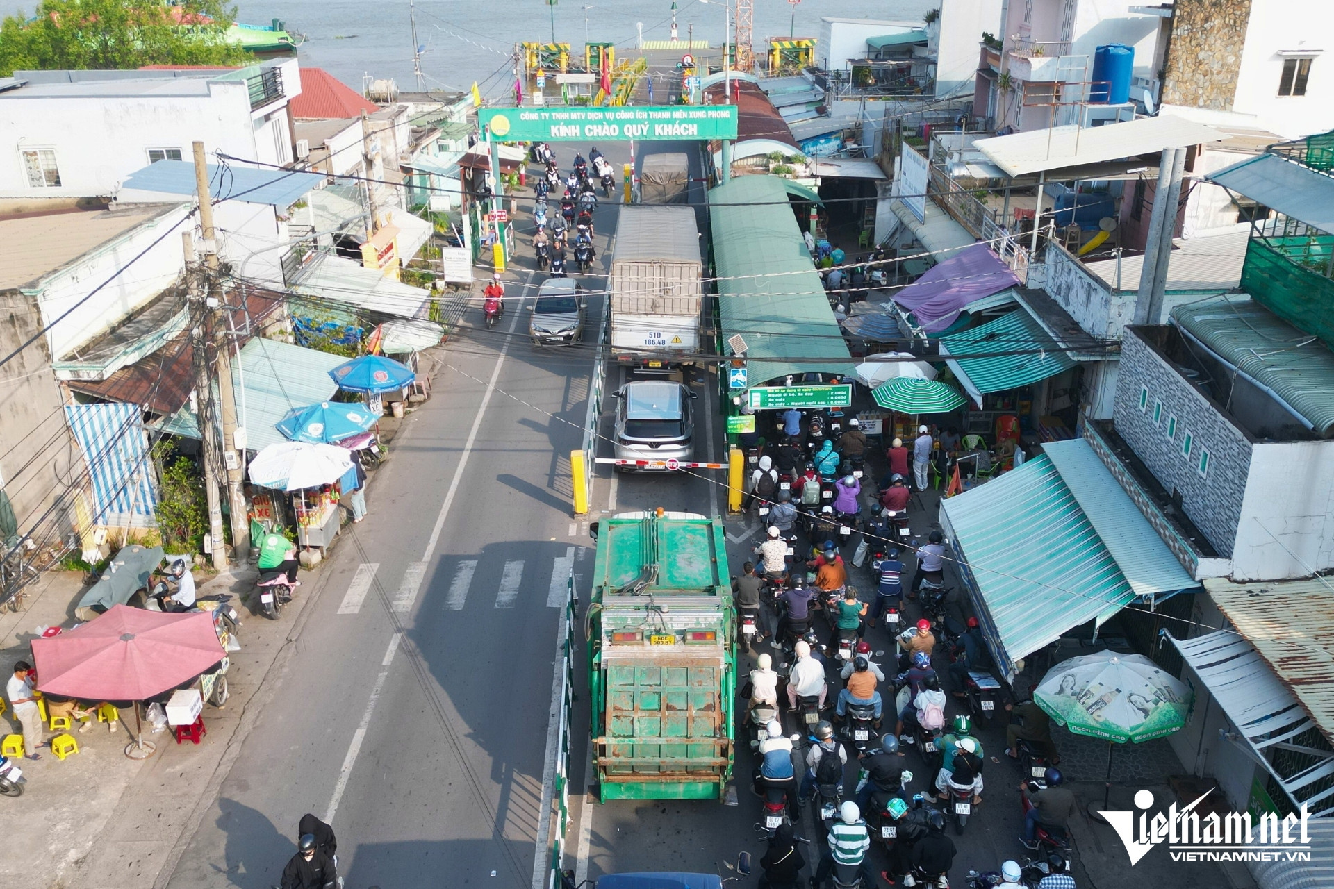 Tại hai đầu bến phà, nhiều thời điểm phương tiện xếp hàng kéo dài hàng trăm mét. Nhân viên bến phà phải liên tục di chuyển ra xa để bán vé, hạn chế tình trạng ùn ứ trước lối xuống phà.
