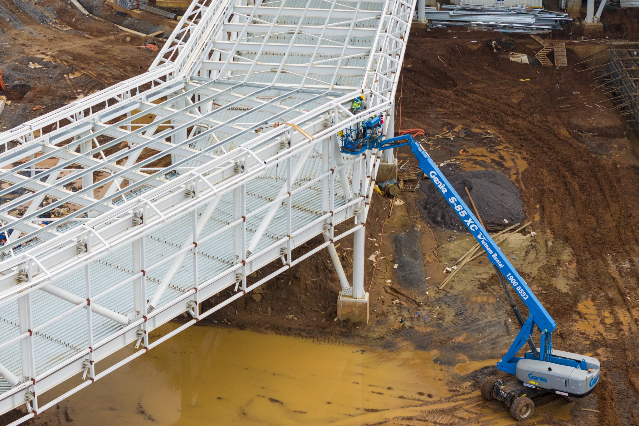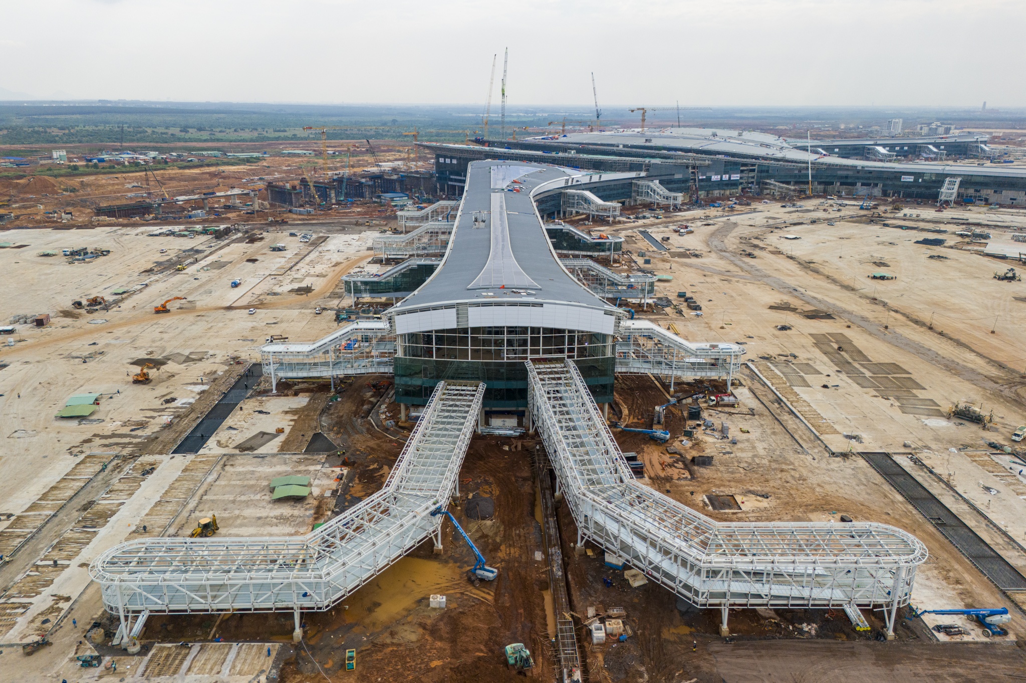 Hạng mục cầu ống lồng cố định kết nối nhà ga hành khách và sân đỗ máy bay đã thi công hoàn thành cơ bản phần khung thép, đang được thi công hoàn thiện lắp kính.