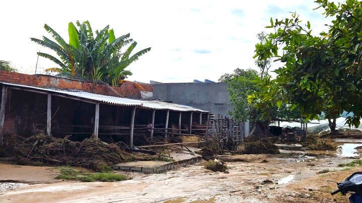 Vụ vỡ hồ chứa nước ở xã Tuy Phong, tỉnh Lâm Đồng khiến nhiều nhà cửa, cây cối ở đây bị cuốn trôi. Một khung cảnh tan hoang trải dài theo đường cuốn trôi cả dòng nước dữ.