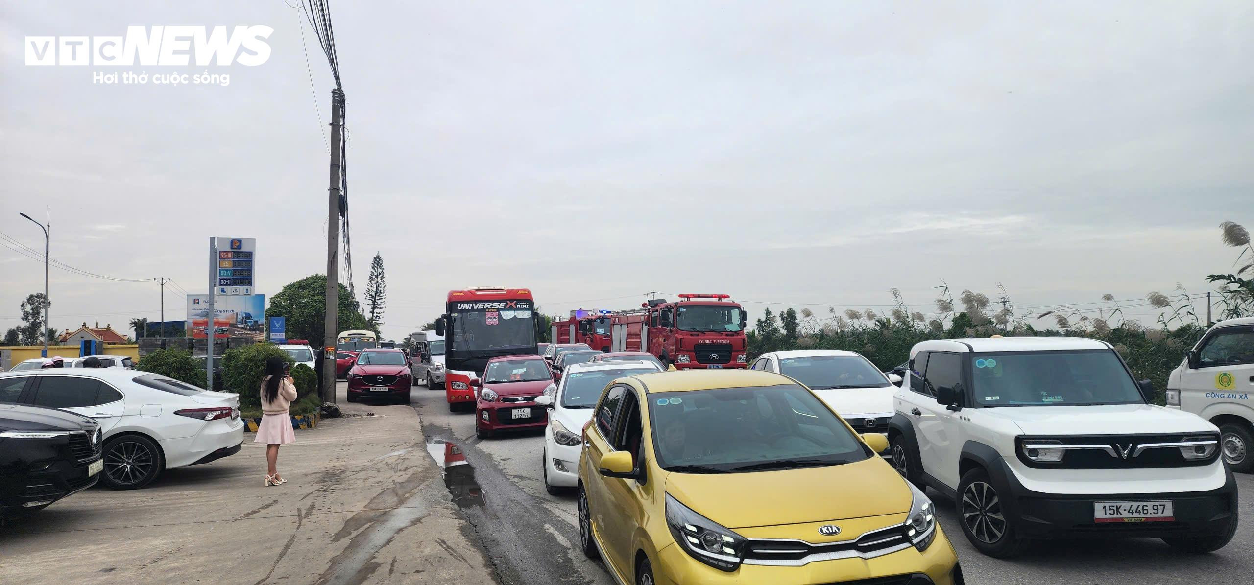 Lực lượng chức năng tổ chức phân luồng giao thông khu vực cổng công ty xảy ra vụ cháy.