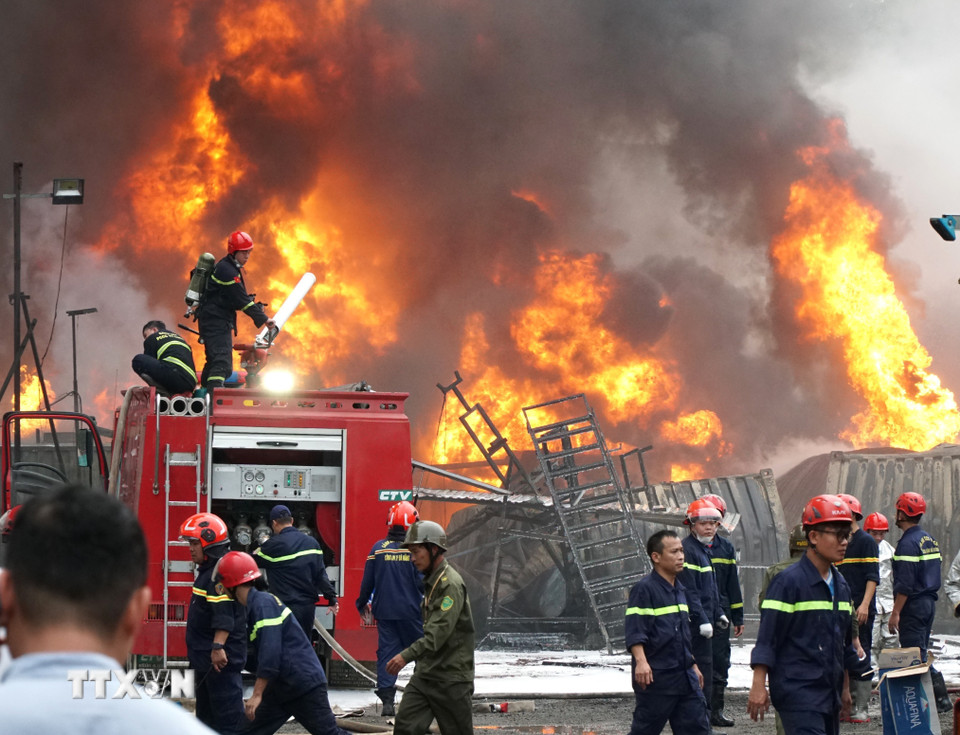 Gió to khiến ngọn lửa bùng phát mạnh, đám cháy phát ra nhiều tiếng nổ lớn. (Ảnh: Quốc Dũng/TTXVN)