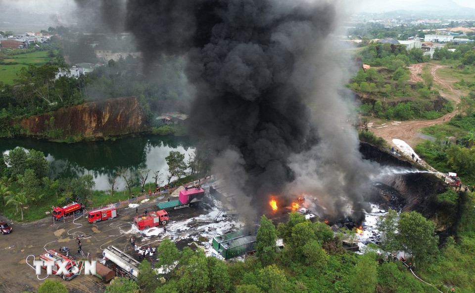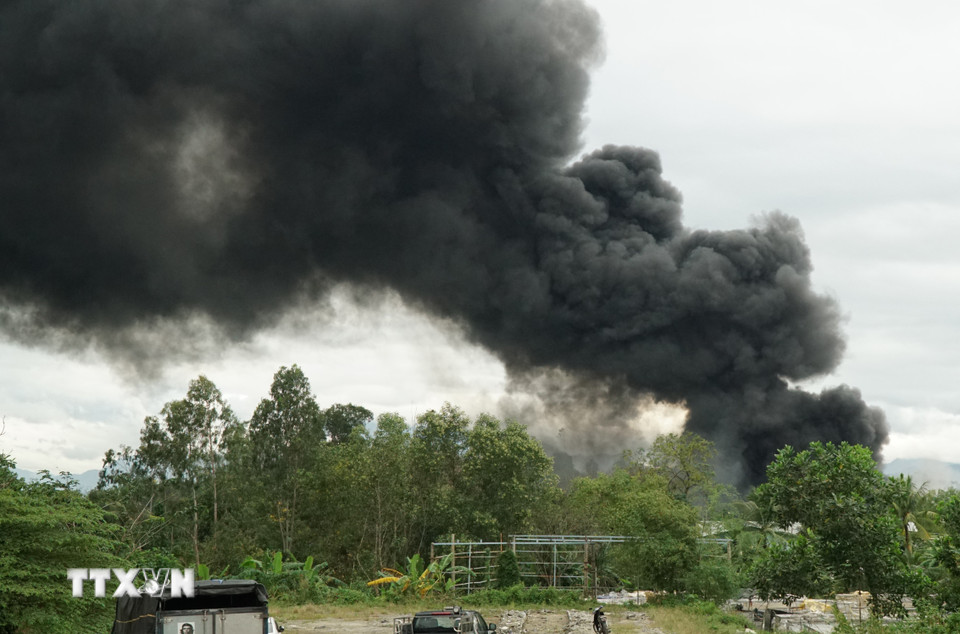 Đám cháy gây ra cột khói lớn, bao trùm cả khu vực. (Ảnh: Quốc Dũng/TTXVN)