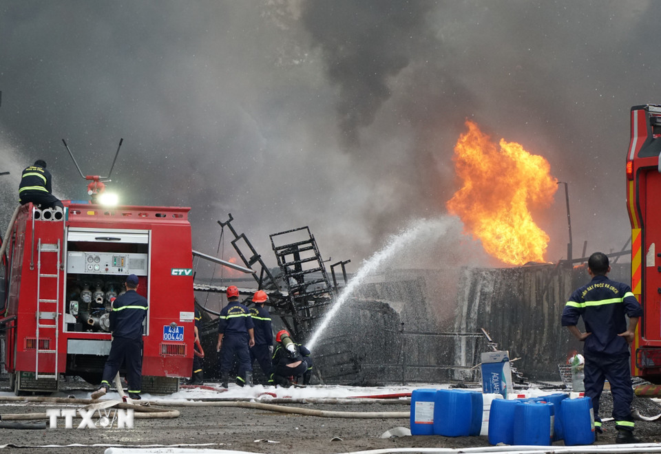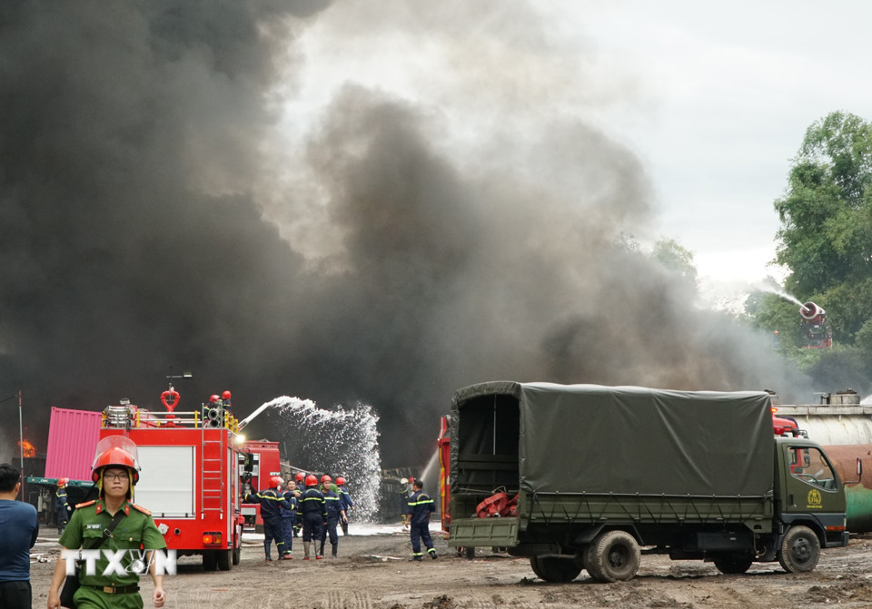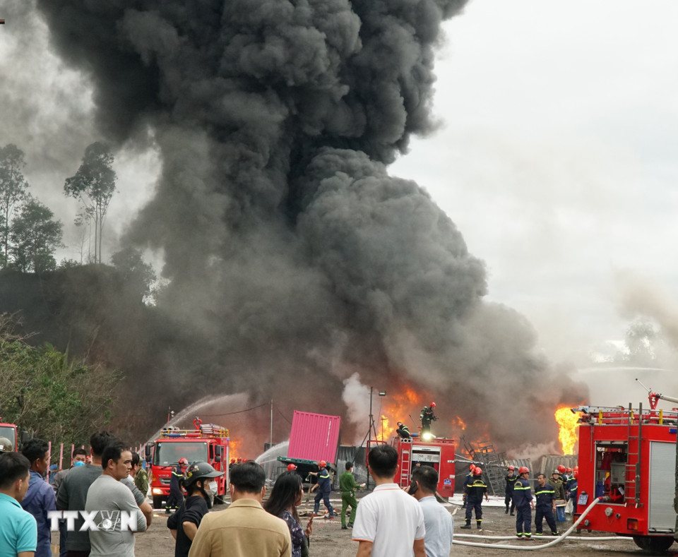 Đám cháy bùng phát tại bãi đỗ xe hàng hóa ngoài trời. (Ảnh: Quốc Dũng/TTXVN)