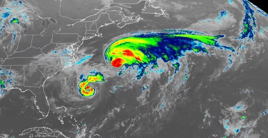 "Bão song sinh" Imelda và Humberto ở khu vực bờ biển phía đông nước Mỹ. Ảnh: CIRA/RAMMB/NOAA.
