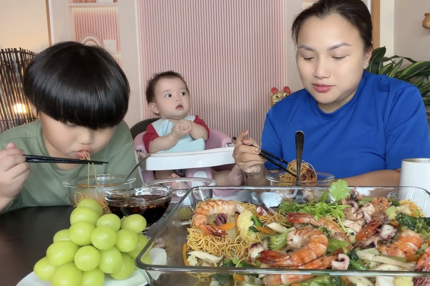 Trên kênh YouTube, video mukbang vẫn được Quỳnh Trần JP đăng tải thường xuyên. Bé Na - em gái của Sa - thay anh trai mukbang cùng mẹ. Ảnh: Quỳnh Trần JP.