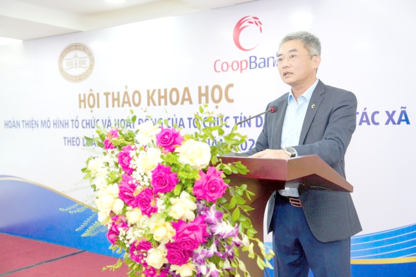 Ông Nguyễn Quốc Cường - Chủ tịch Hiệp hội, Chủ tịch HĐQT Co-opBank phát biểu tại Hội thảo Hoàn thiện mô hình tổ chức và hoạt động của tổ chức tín dụng là Hợp tác xã theo Luật Các TCTD