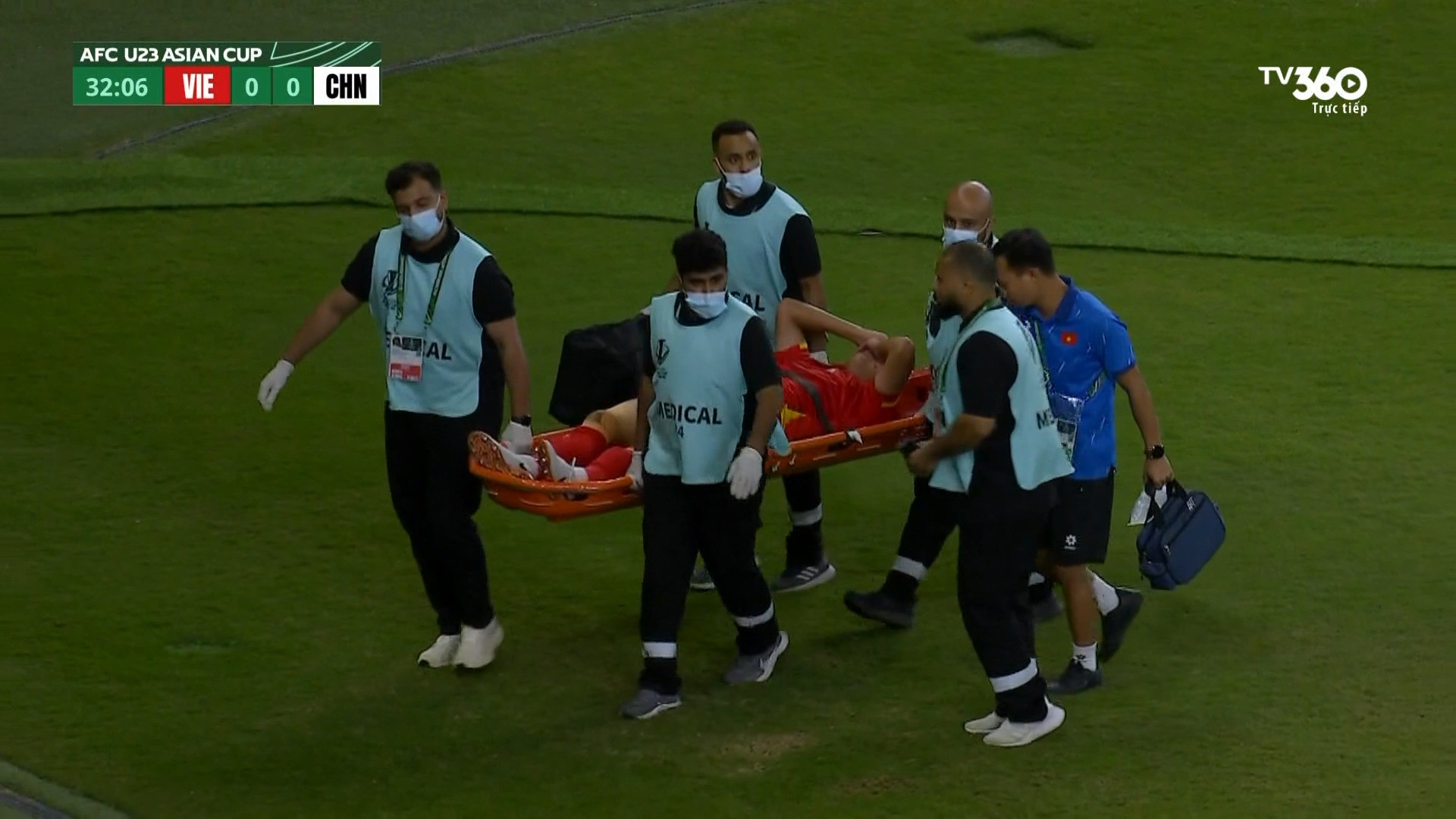 Sau ít phút, bộ phận y tế U23 Việt Nam ra dấu hiệu thay người. Hiểu Minh phải rời sân bằng cáng. Anh ôm mặt bật khóc nức nở khi cảm nhận về khả năng chấn thương nặng của mình.