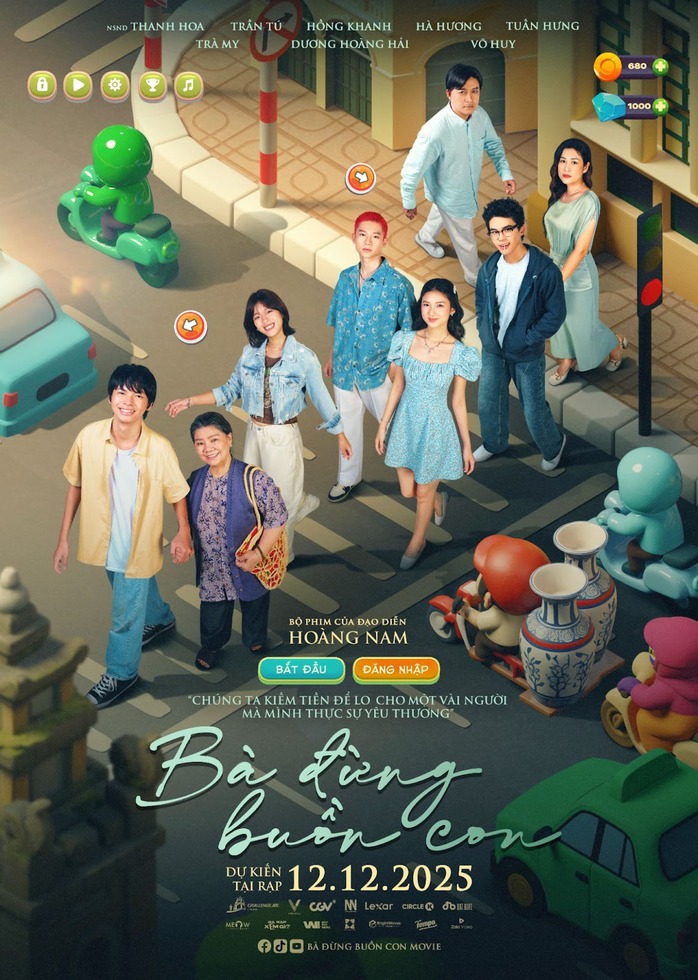 Nhà sản xuất phim "Bà đừng buồn con" ngày 24-10 tung poster, video clip quảng bá. Trong đó, poster đầu tiên sử dụng hình ảnh đồ họa làm chủ đạo, mở ra khung cảnh trong trò chơi do chính nhân vật Tiến (Trần Tú đóng) thiết kế.