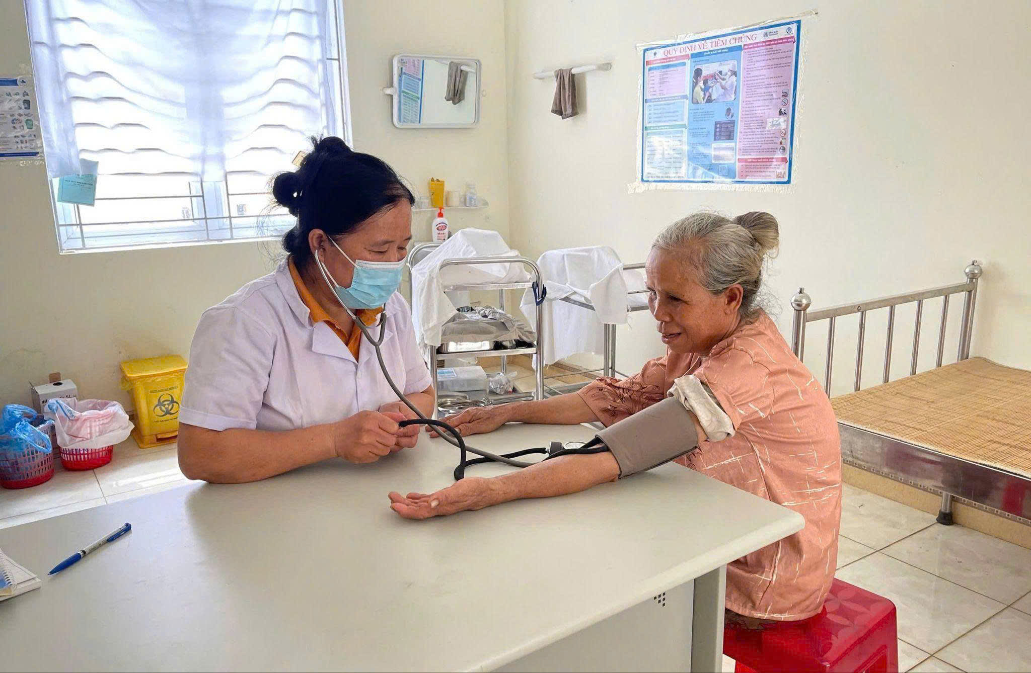 Viên chức Trạm Y tế xã Trường Hà đo huyết áp, theo dõi sức khỏe định kỳ cho người dân.