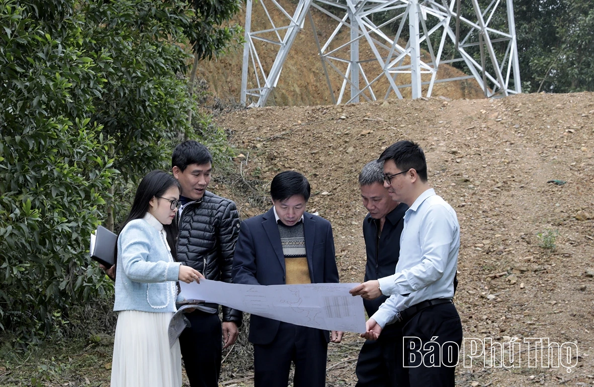 Anh Nguyễn Quý Dương (áo trắng) - cán bộ biệt phái về Chi nhánh Trung tâm phát triển quỹ đất khu vực Hạ Hòa - phối hợp cùng Ban Quản lý dự án điện miền Trung kiểm tra hồ sơ mốc giới giải phóng mặt bằng thi công đường dây 220kV Nghĩa Lộ - Việt Trì.