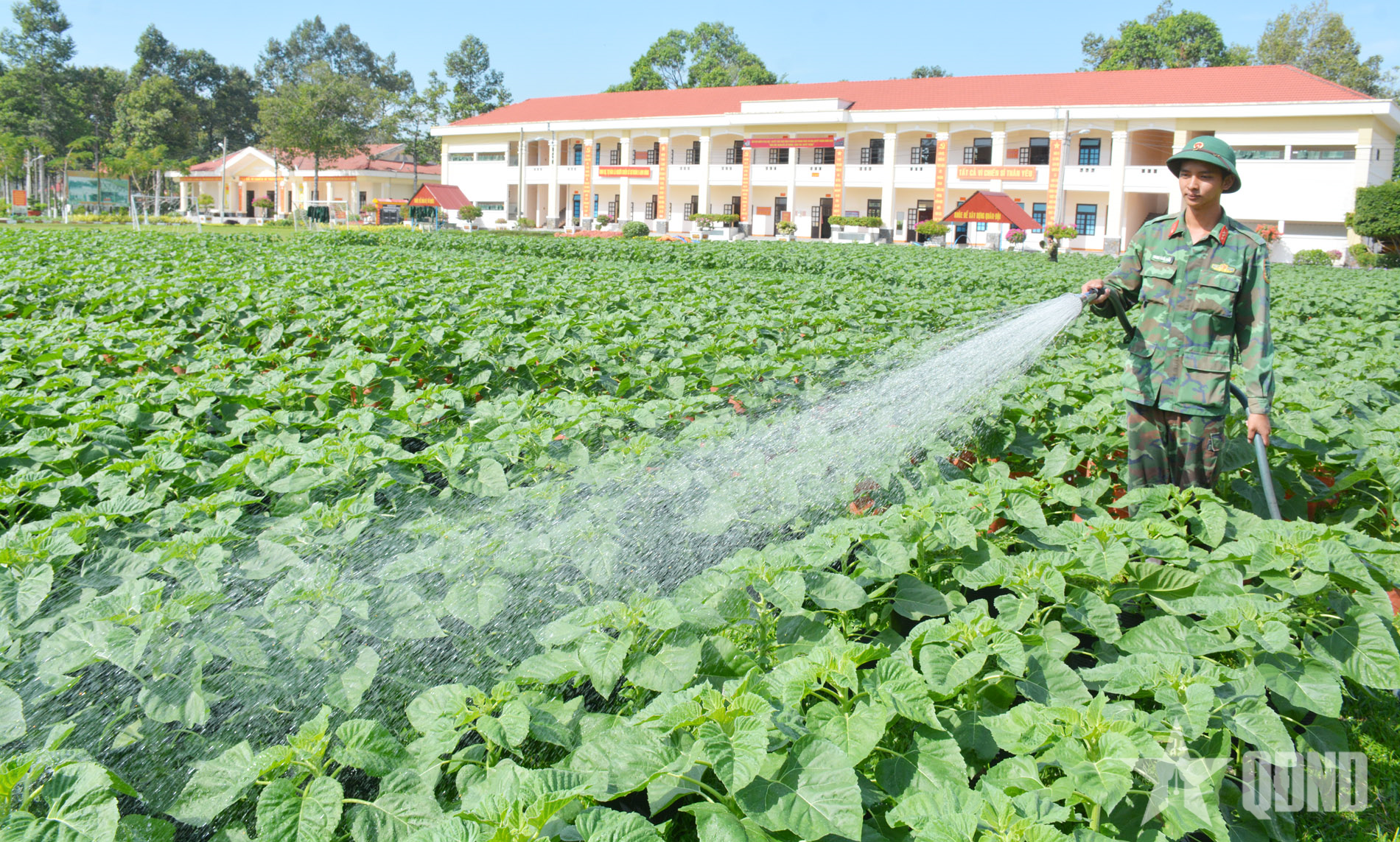 Chiến sĩ Sư đoàn 5 (Quân khu 7) chăm sóc vườn rau xanh.