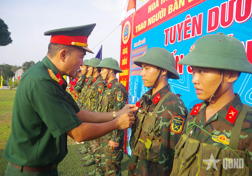 Trung đoàn trưởng Lê Công Danh khen thưởng chiến sĩ bắn giỏi.