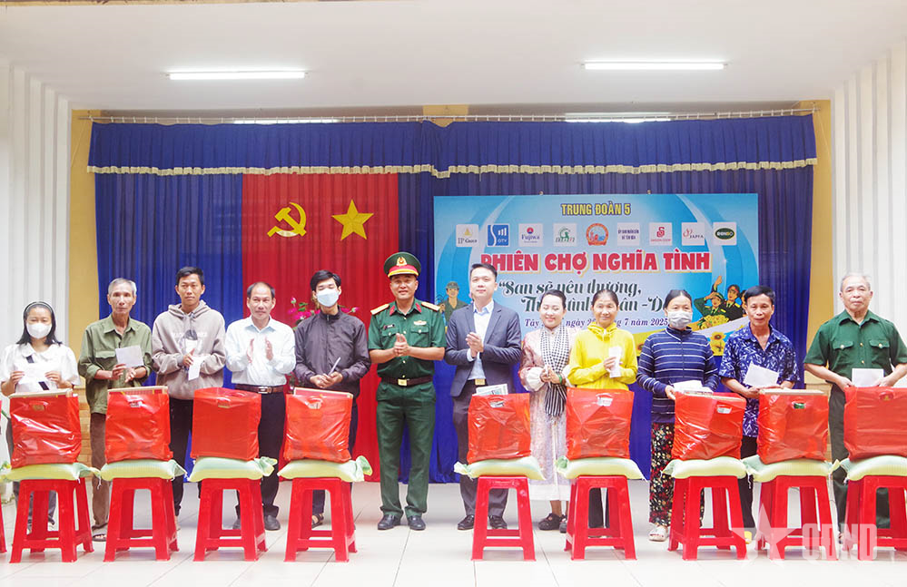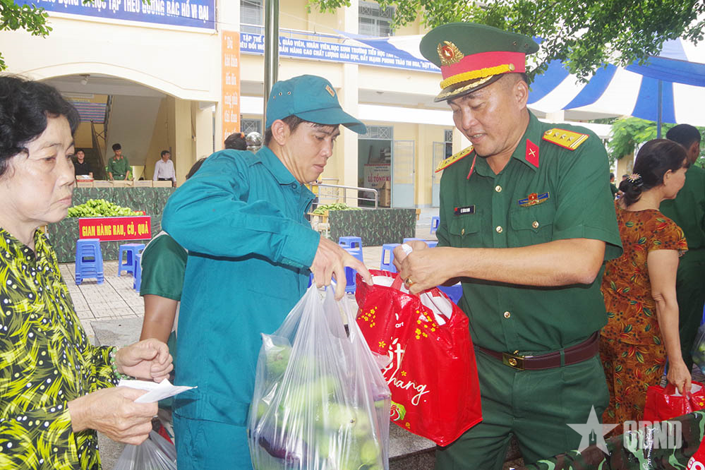 Thượng tá Lê Công Danh tặng quà chiến sĩ dân quân và người dân trên địa bàn.
