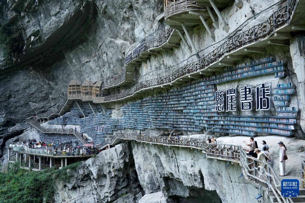 Hiệu sách vách đá thuộc khu thắng cảnh hố sụt Miên Hoa. Ảnh: Xinhua.