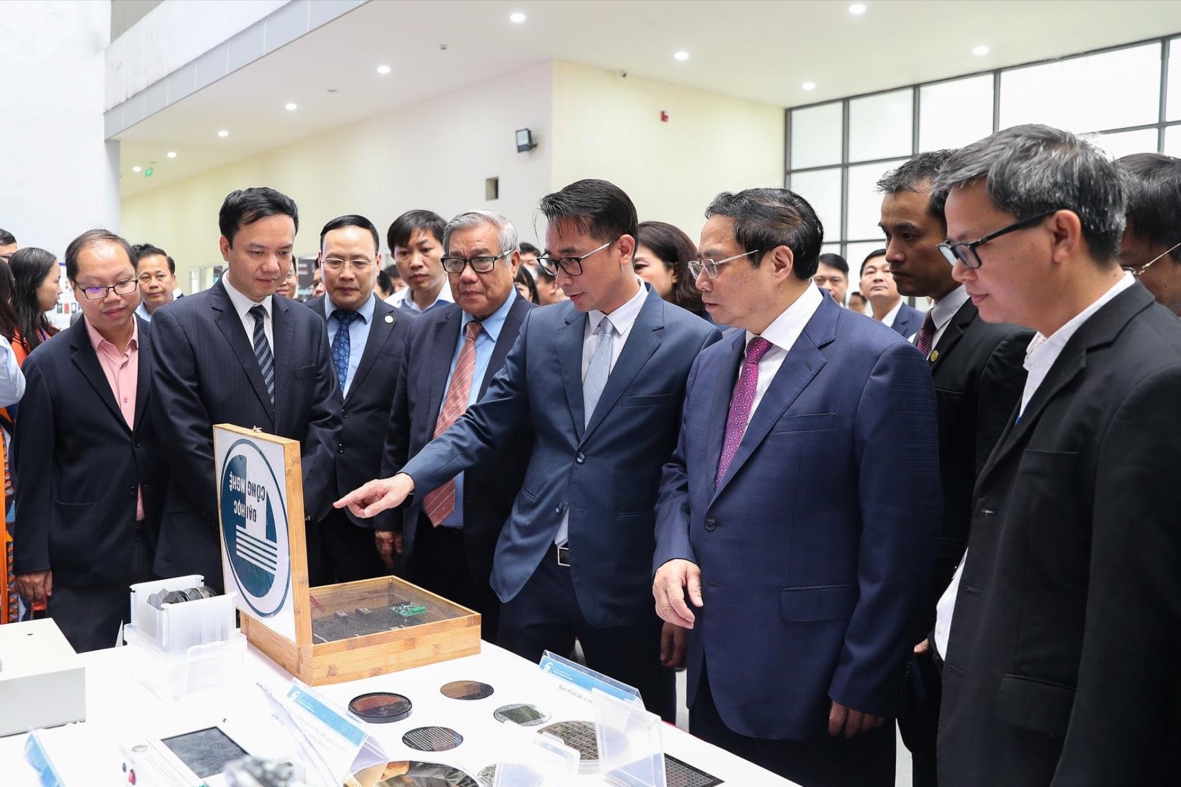 GS.TS Chử Đức Trình, Hiệu trưởng Trường Đại học Công nghệ - Đại học Quốc gia Hà Nội giới thiệu với Thủ tướng Phạm Minh Chính về sản phẩm công nghệ do nhà trường nghiên cứu