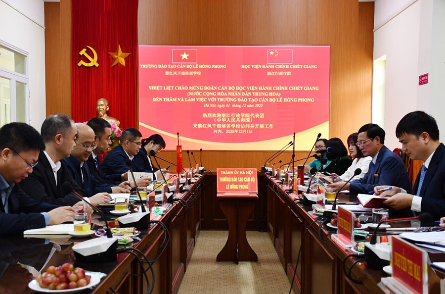 Một buổi trao đổi kinh nghiệm công tác đào tạo, bồi dưỡng cán bộ giữa Trường Đào tạo cán bộ Lê Hồng Phong và Học viện Hành chính Chiết Giang (Trung Quốc). Ảnh: Hoài Nam