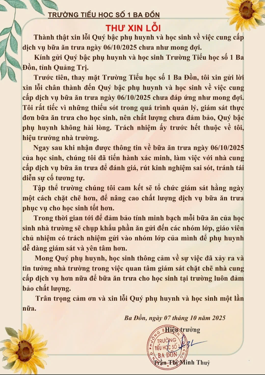 Ngày 7/10, bà Trần Thị Minh Thủy, Hiệu trưởng Trường Tiểu học số 1 Ba Đồn (phường Ba Đồn, tỉnh Quảng Trị) cho biết, đã gửi thư xin lỗi tới phụ huynh và học sinh liên quan đến bữa ăn trưa hôm qua (6/10) chưa đạt yêu cầu.