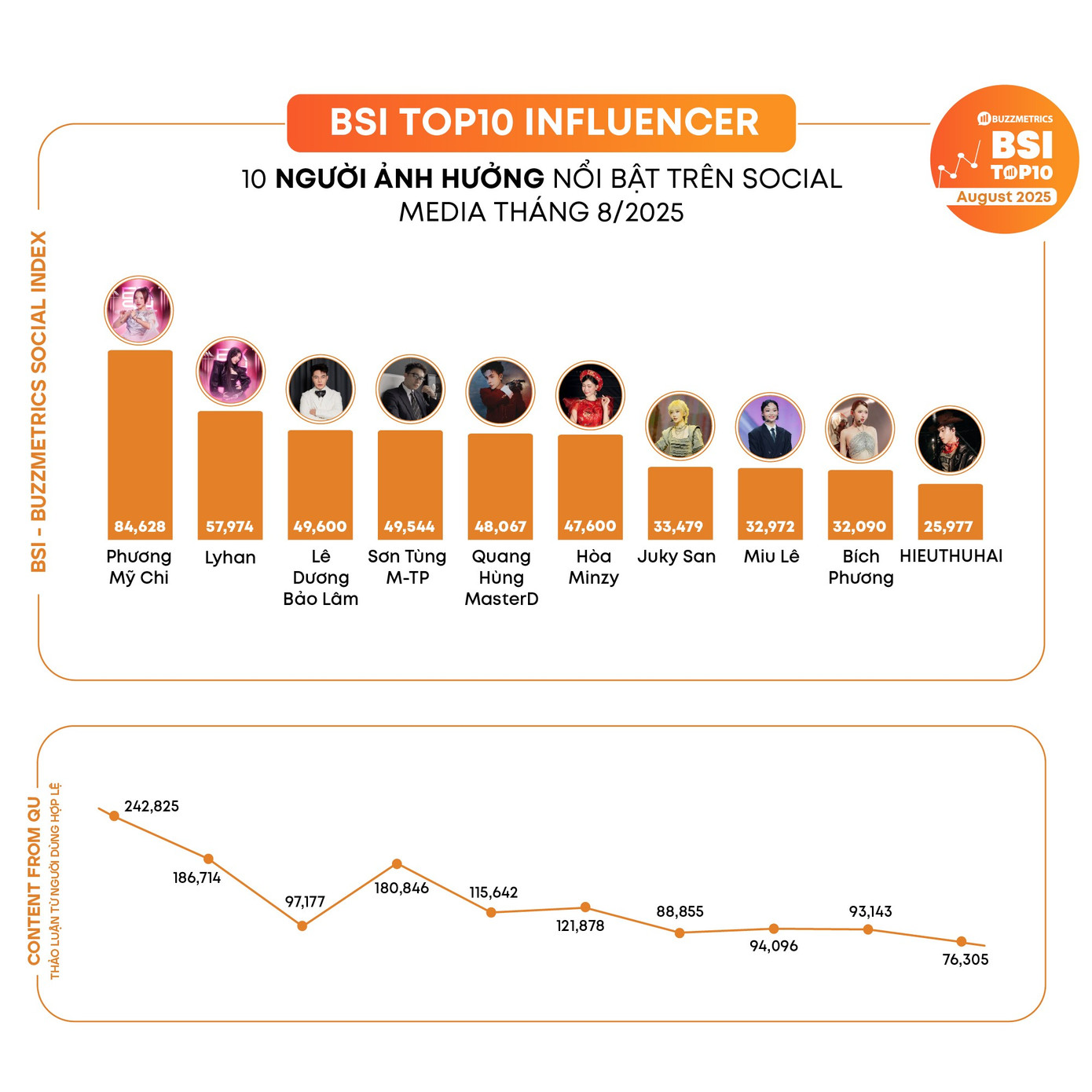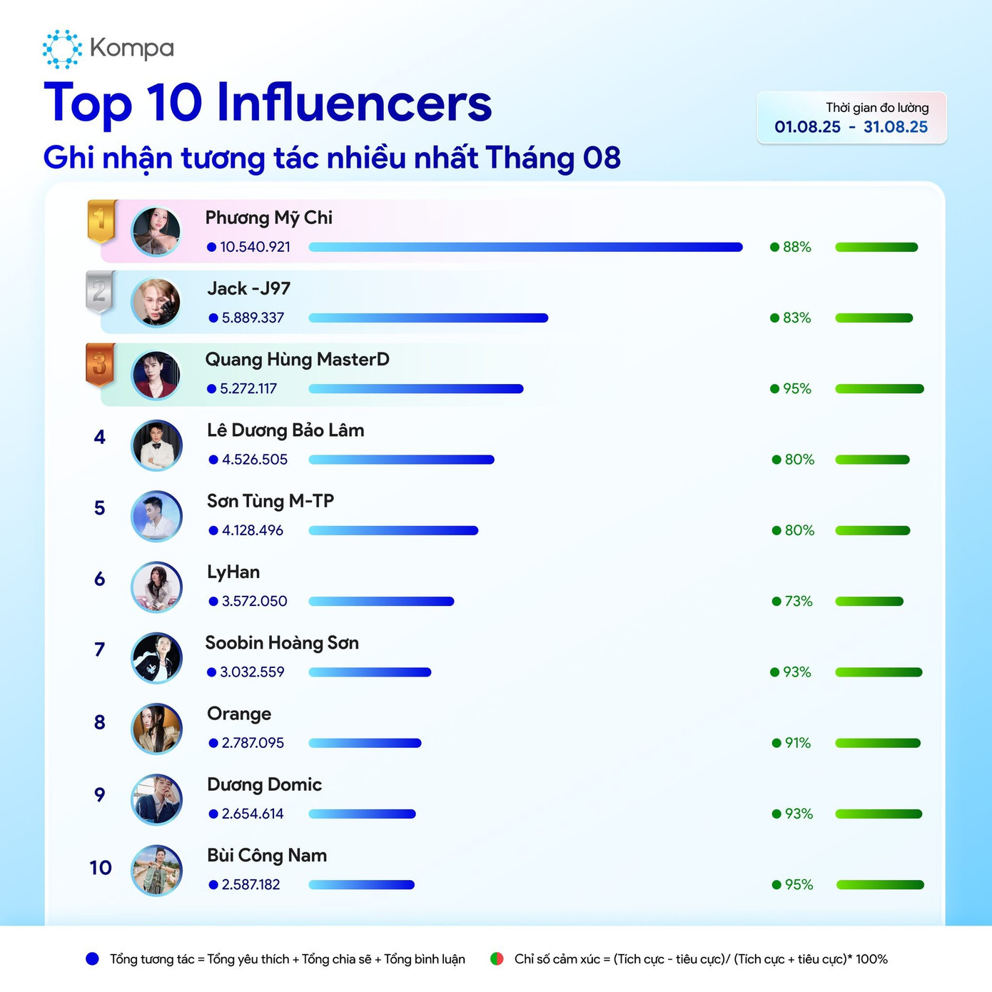 Một thống kê khác từ Kompa cũng cho thấy kết quả tương tự. Phương Mỹ Chi là influencer nhận lượng tương tác ấn tượng nhất tháng 8. Giọng ca Vũ Trụ Có Anh dẫn đầu áp đảo với 10,5 triệu lượt, đạt 88% cảm xúc tích cực. Chỉ số của "em xinh" cao gấp 1,8 lần vị trí thứ 2 là Jack - J97 (5,8 triệu lượt).