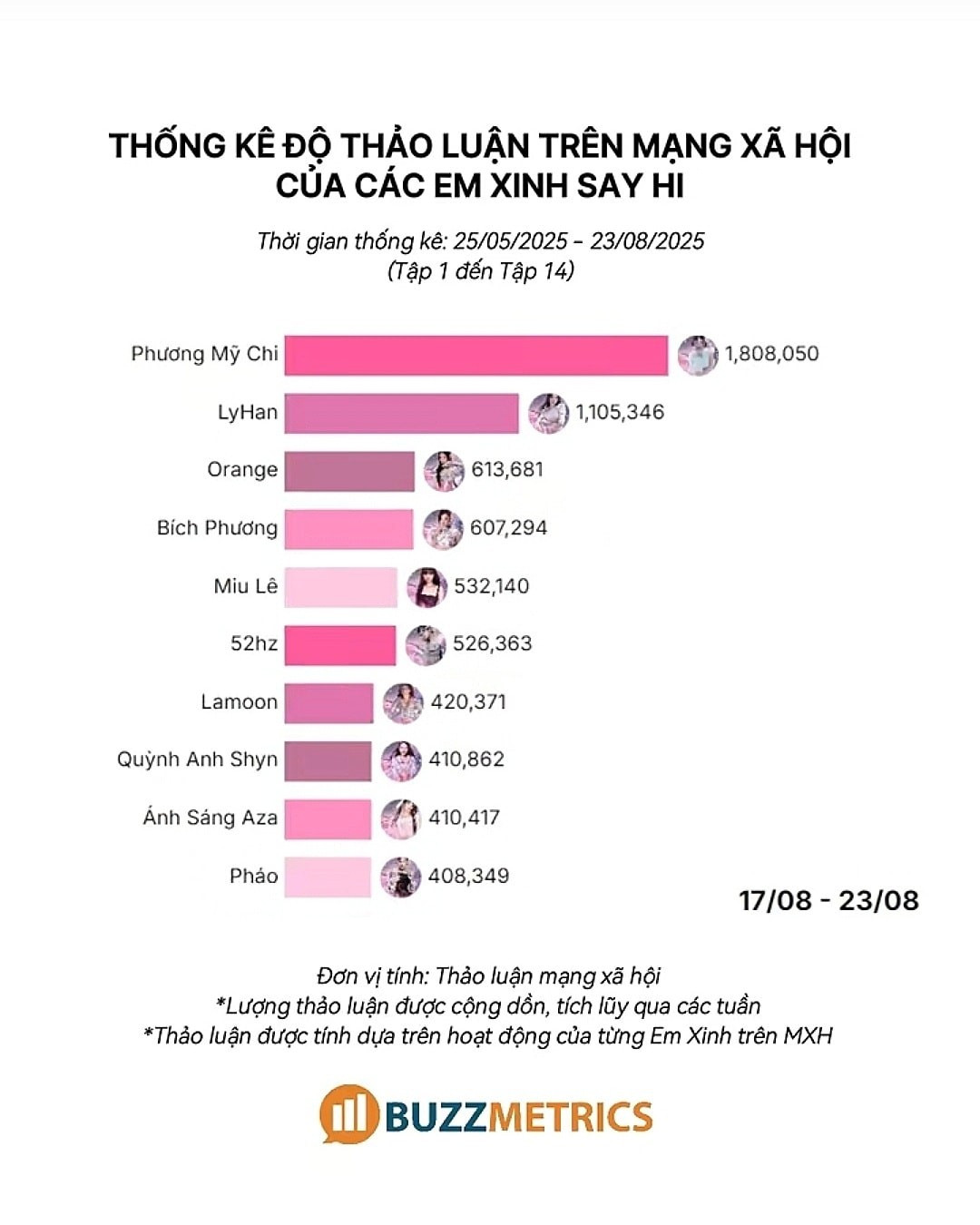 Hiệu ứng từ show giải trí cũng giúp tên tuổi của dàn thí sinh tham gia thăng hạng vượt bậc. BXH 10 người ảnh hưởng nổi bật trên Social Media cùng tháng cho thấy có tới một nửa số gương mặt được gọi tên là "em xinh" gồm: Phương Mỹ Chi, , Miu Lê, và Bích Phương.