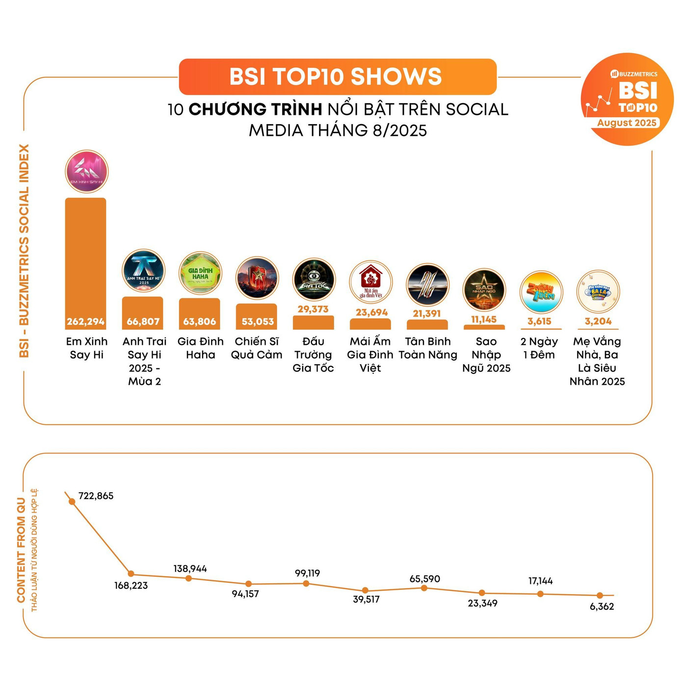 Số liệu từ Buzzmetrics trong BXH Top 10 chương trình nổi bật trên mạng xã hội tháng 8/2025 mới công bố cho thấy thống trị tuyệt đối với hơn 262K lượt BSI (Buzzmetrics Social Index). Chỉ số thảo luận từ người dùng mạng của chương trình này vượt mức 722K lượt, tạo ra khoảng cách khổng lồ với vị trí thứ hai (hơn 168K lượt).