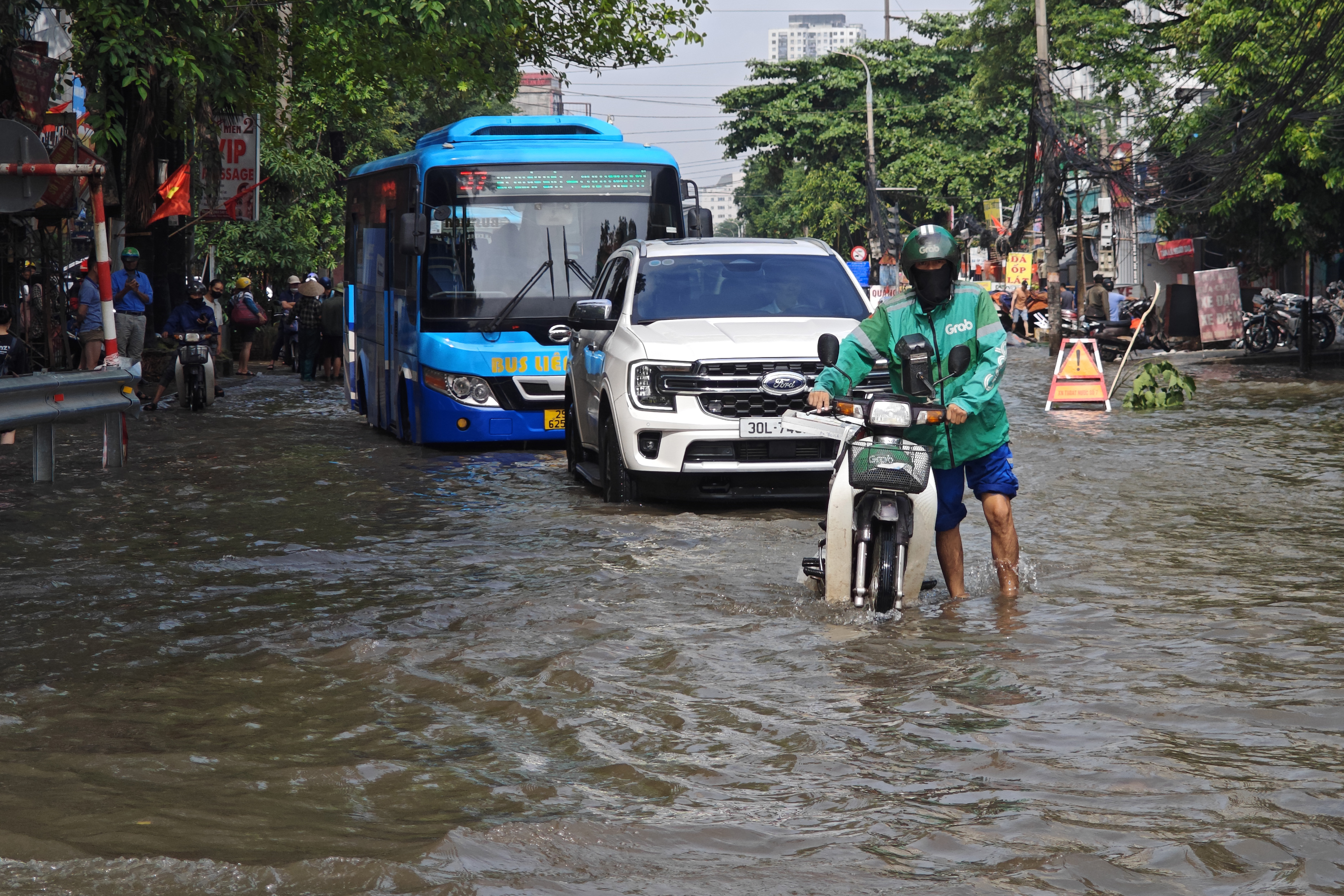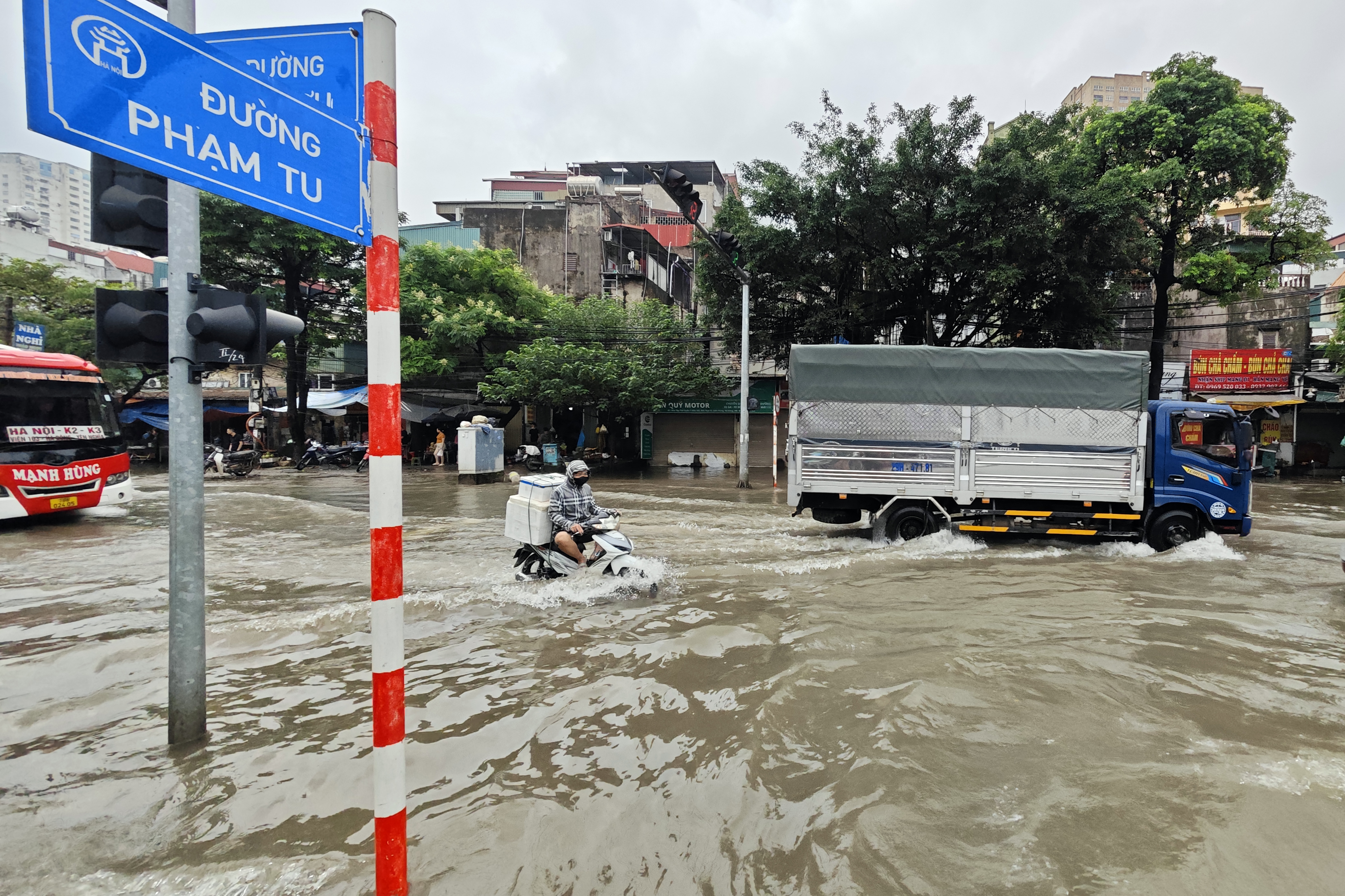 Sáng 8-10, tại ngã ba Phạm Tu - Cầu Bươu (phường Thanh Liệt, Hà Nội), mực nước còn dâng cao khoảng nửa mét.