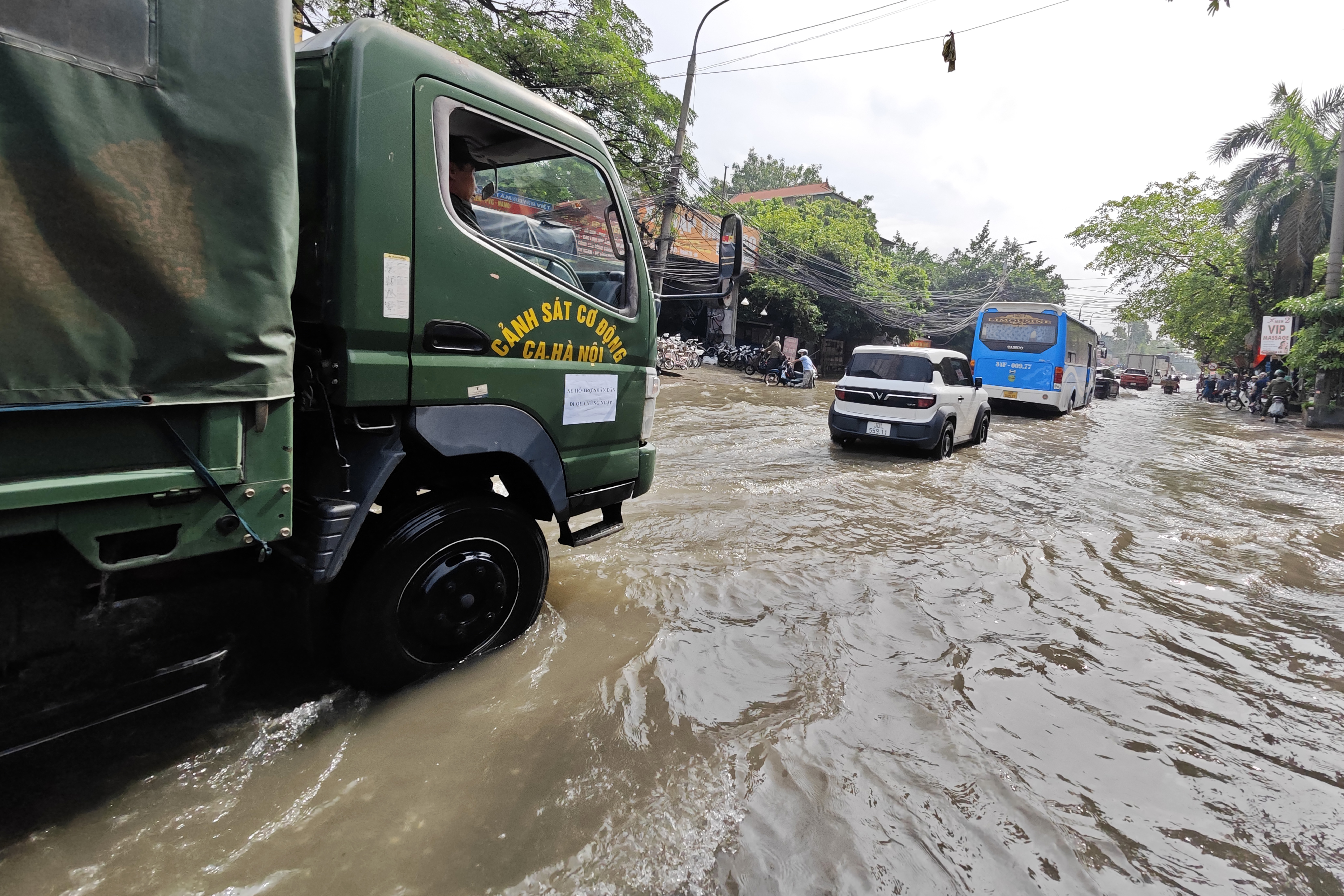Đây là ngã tư đi vào Bệnh viện K Tân Triều nên hôm nay, Tiểu đoàn 3, Phòng Cảnh sát cơ động CATP Hà Nội tiếp tục ứng trực, dùng xe chuyên dụng để hỗ trợ người dân qua điểm ngập sâu