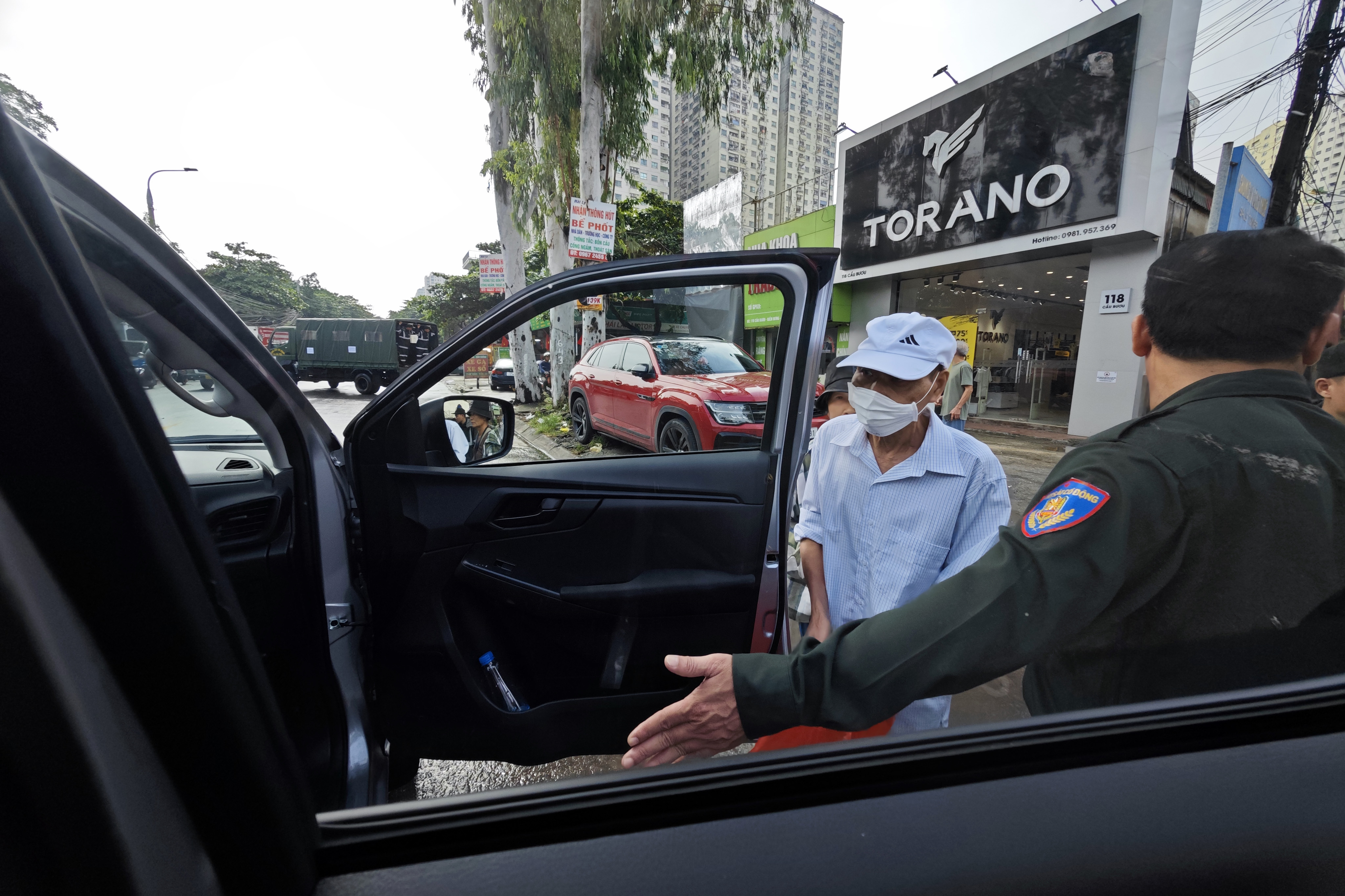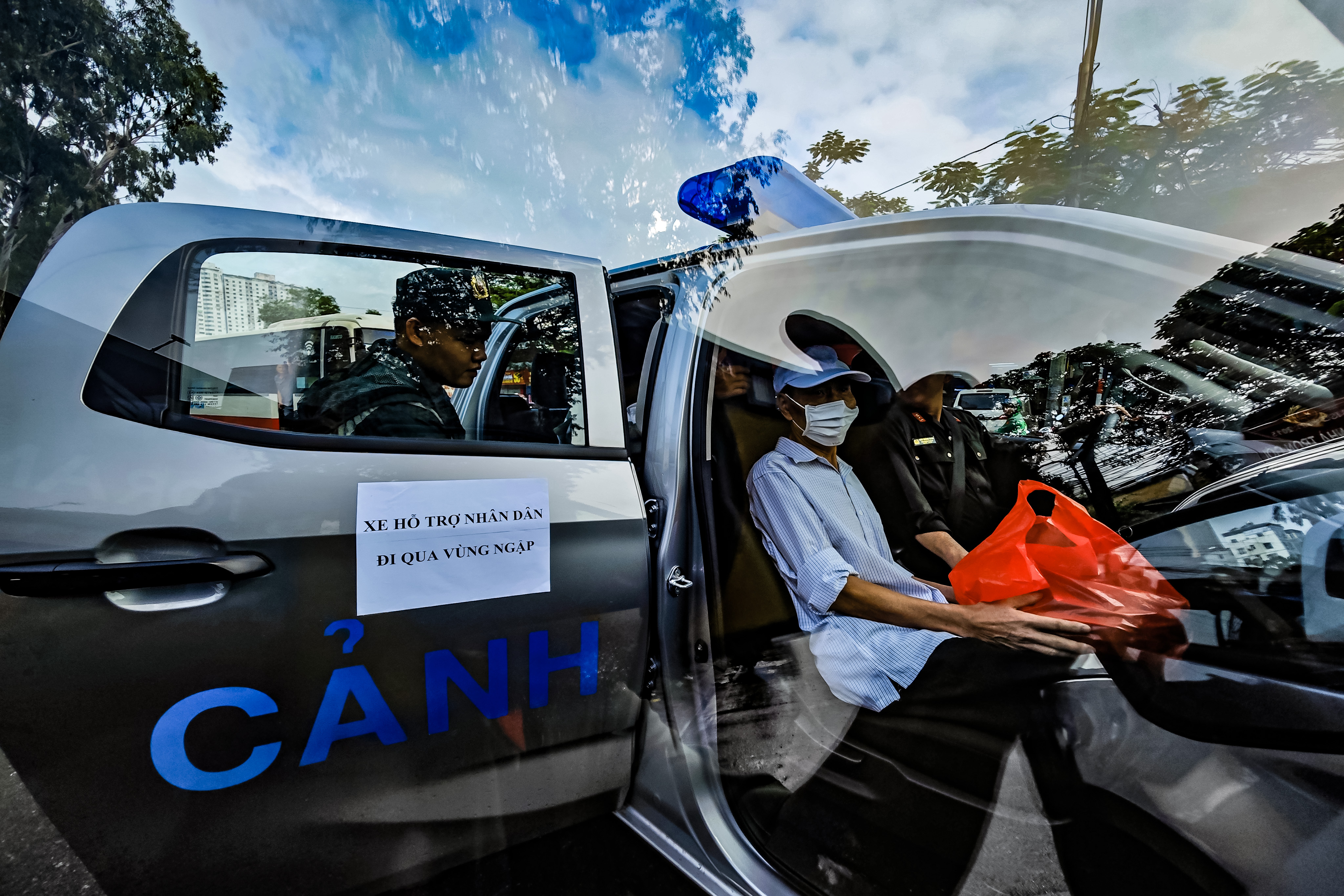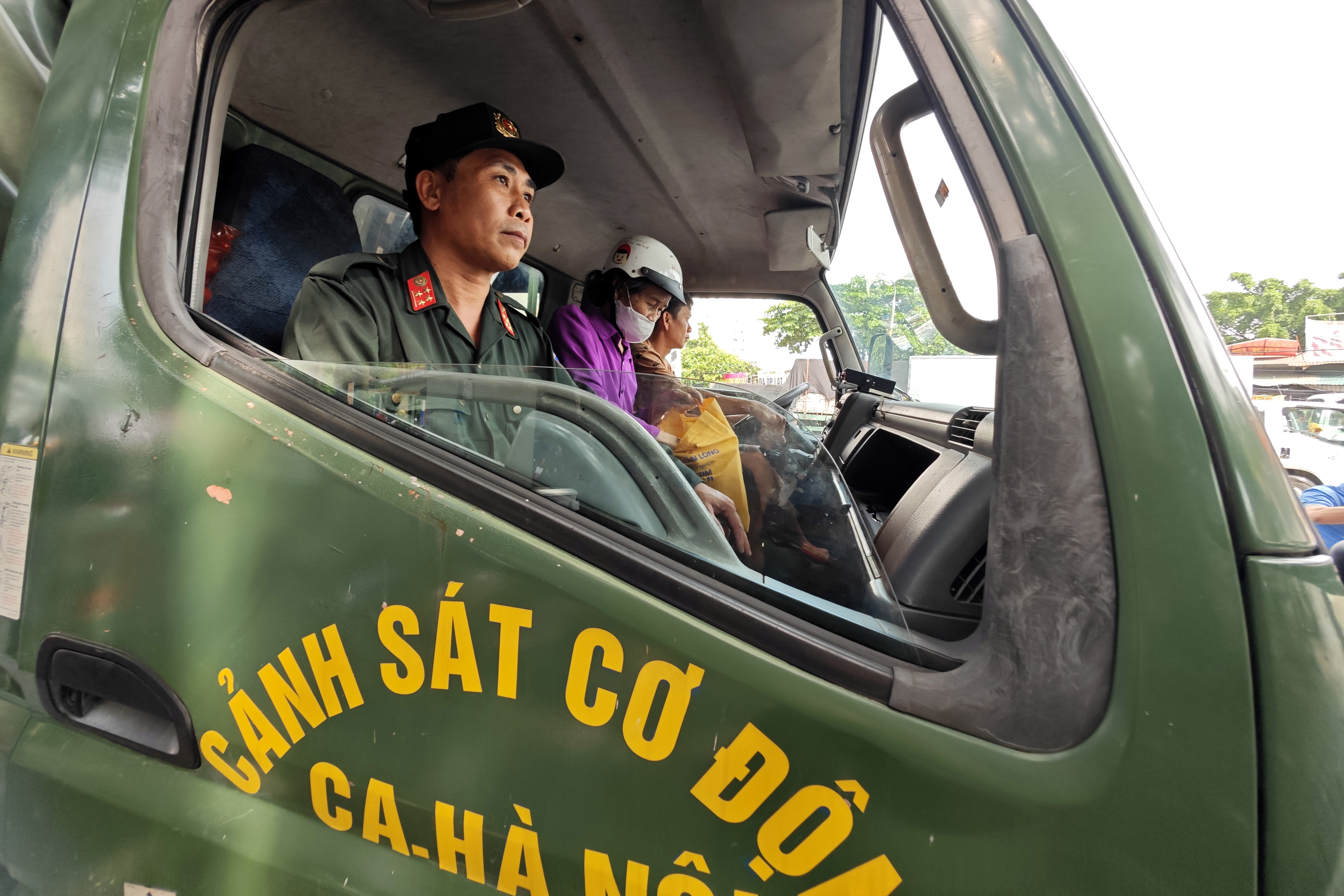 Cảnh sát cơ động CATP Hà Nội mời người cao tuổi lên xe gầm cao để chở vào Viện K Tân Triều