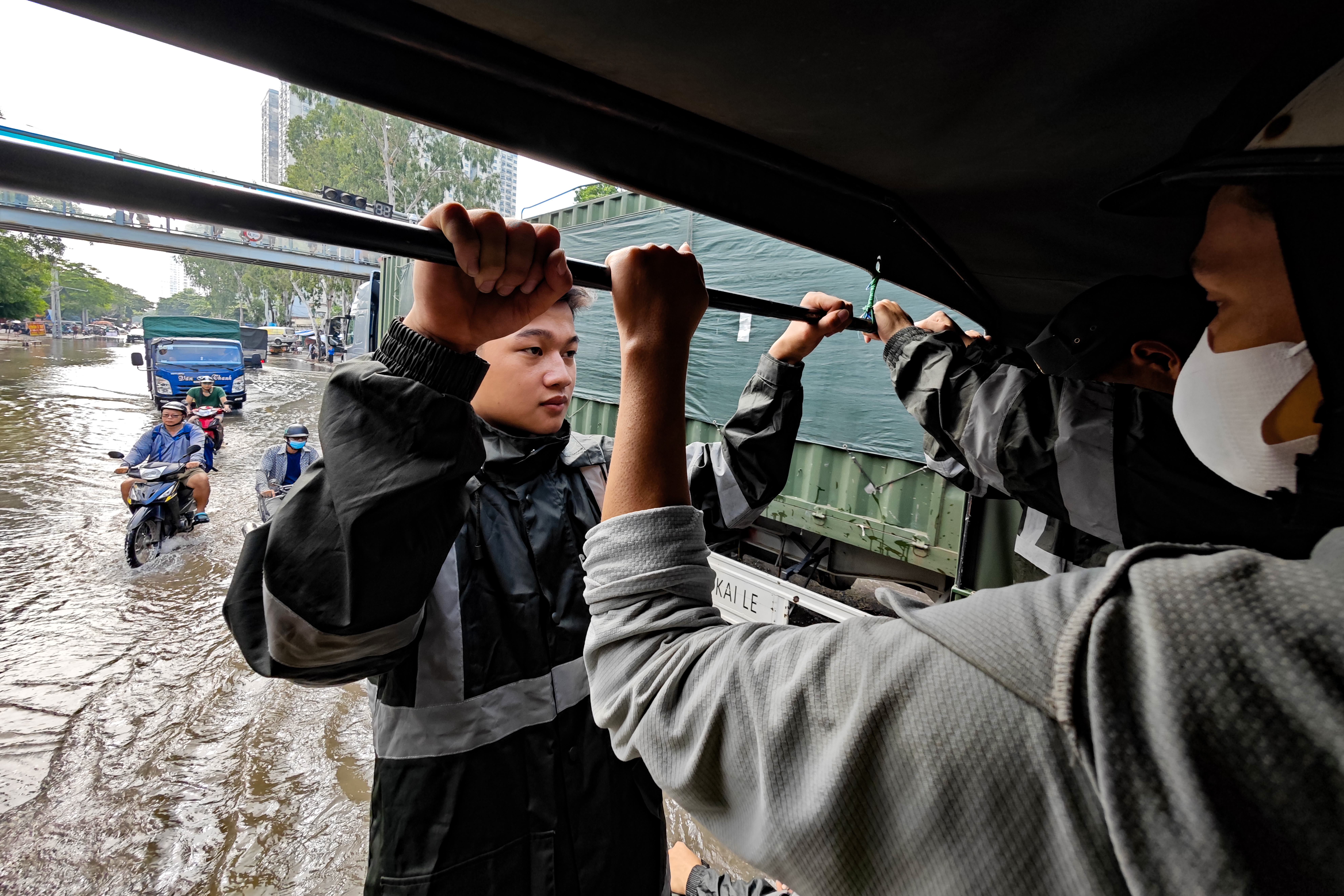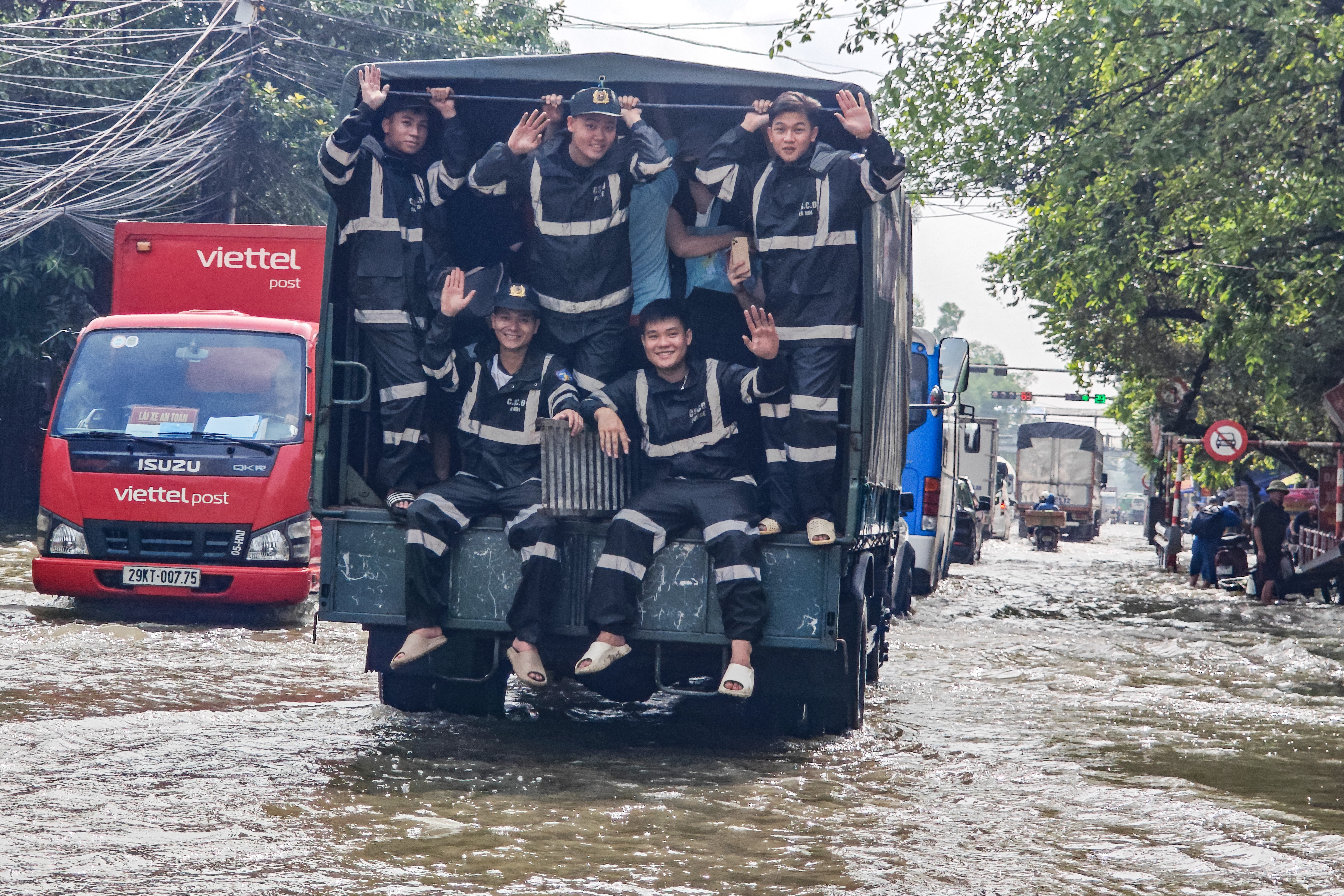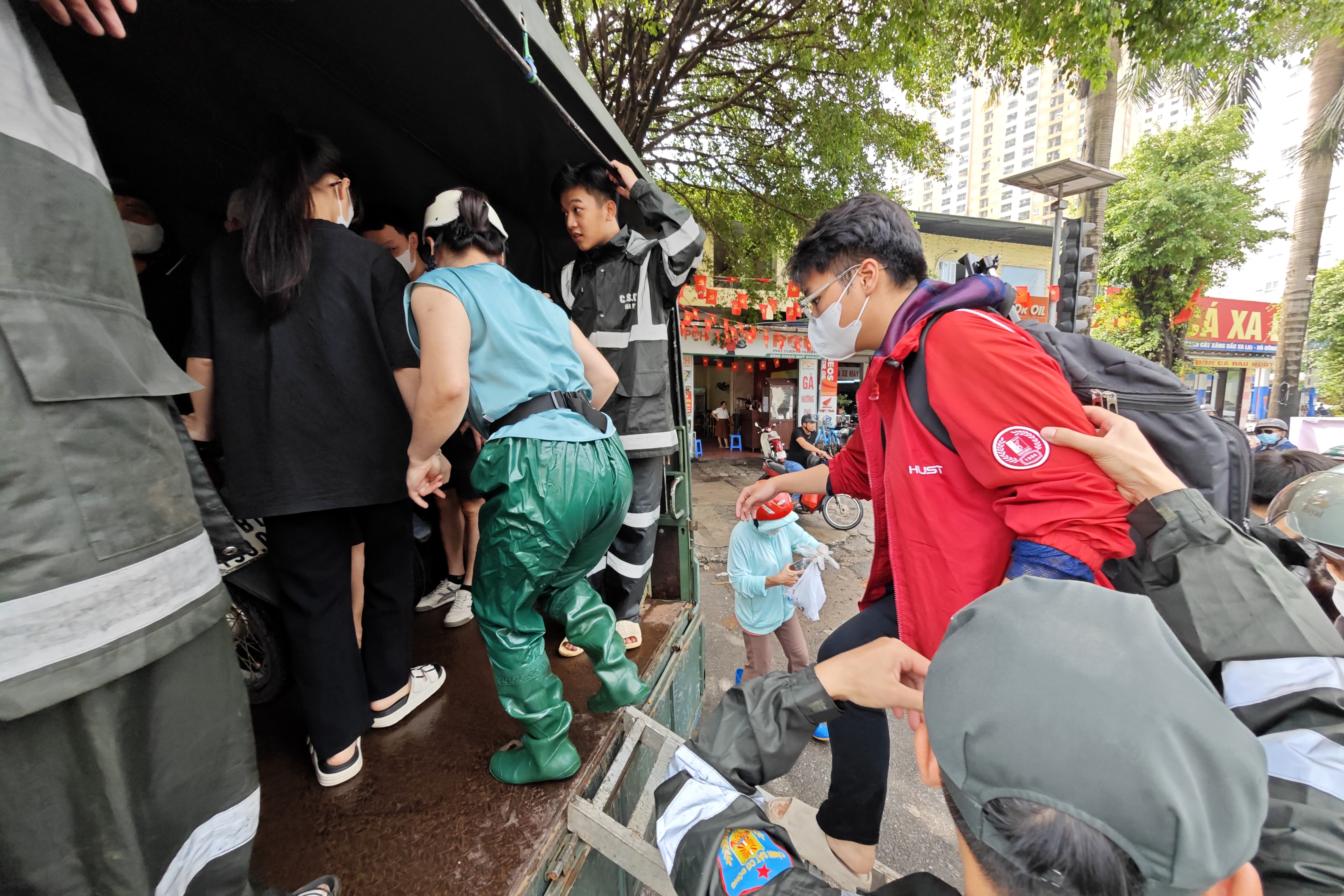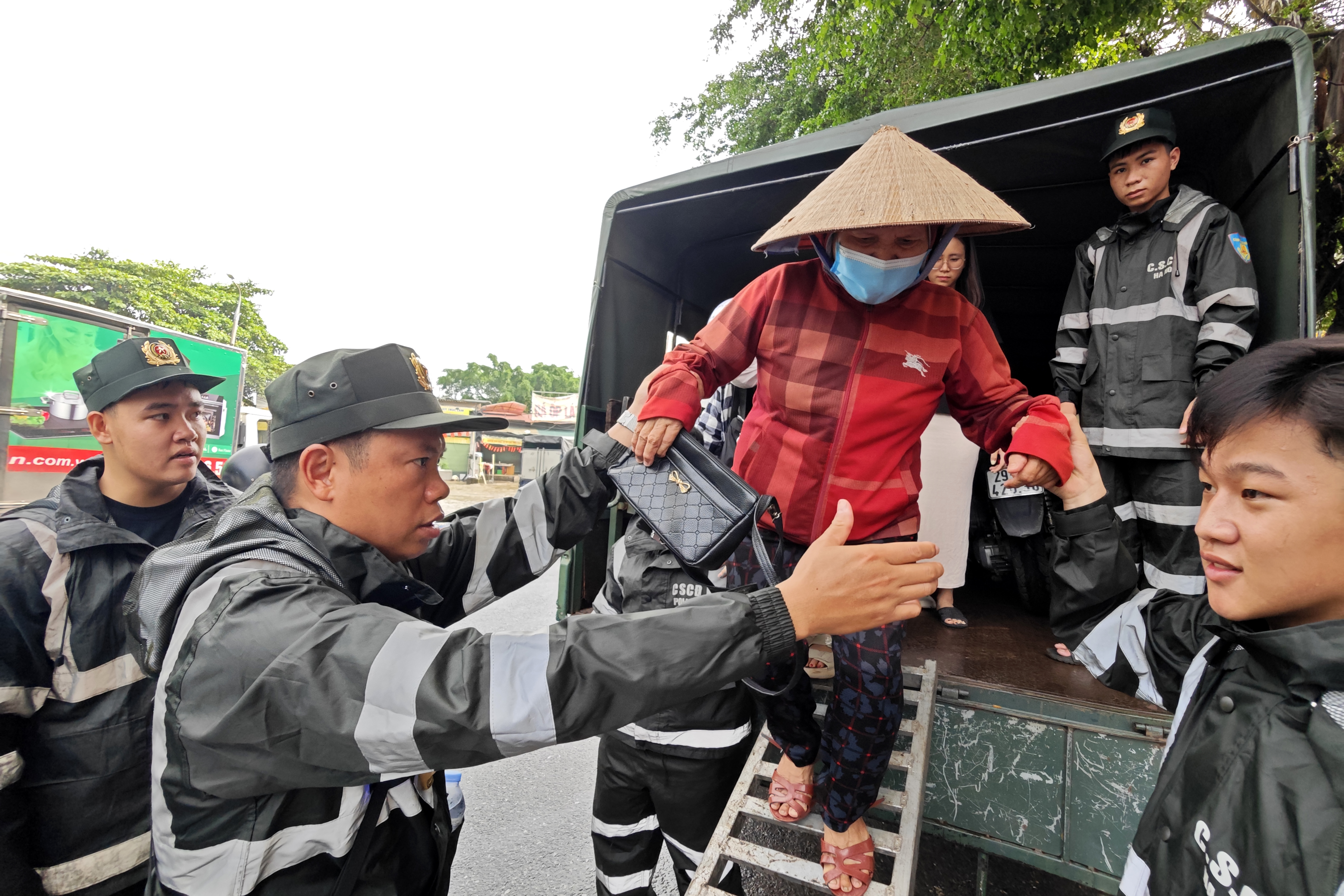 Các chiến sỹ trẻ đứng phía cuối thùng xe tải chuyên dụng để đảm bảo an toàn cho người dân phía trong