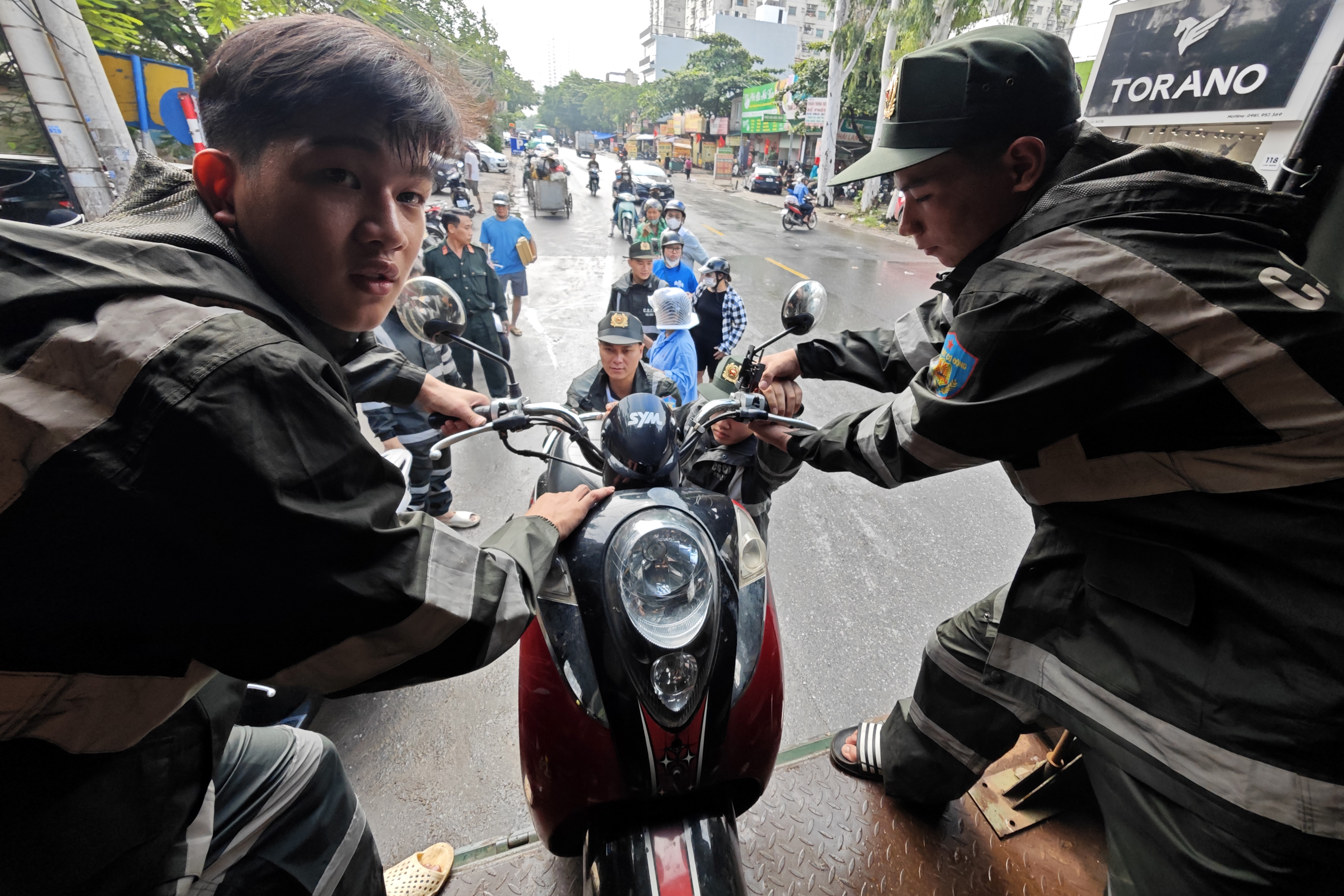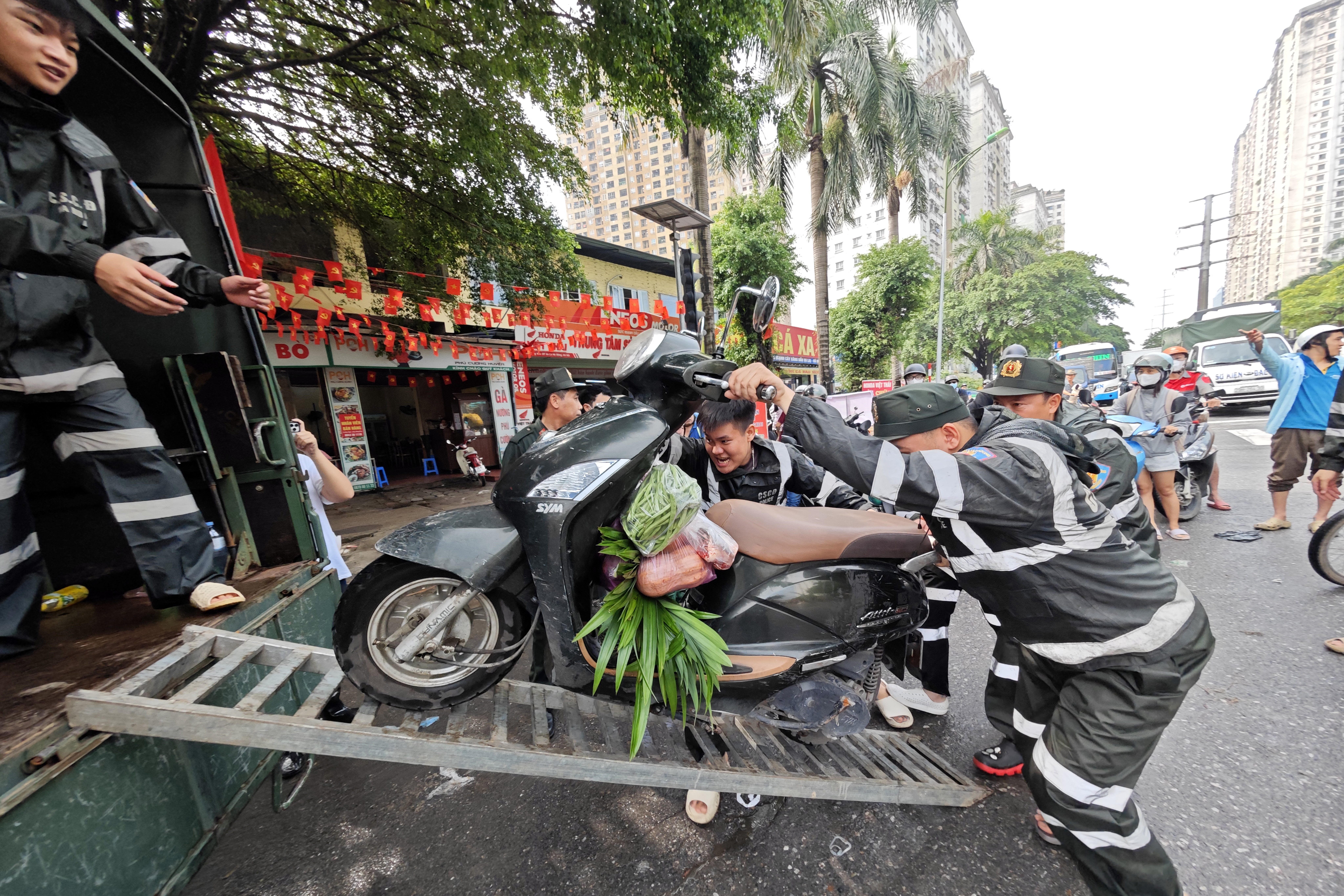 Khu vực này giao thông bình thường khá đông đúc. Các cán bộ, chiến sỹ Tiểu đoàn 3 - Phòng Cảnh sát cơ động CATP làm việc liên tục để chuyển phương tiện người dân lên xe chuyên dụng