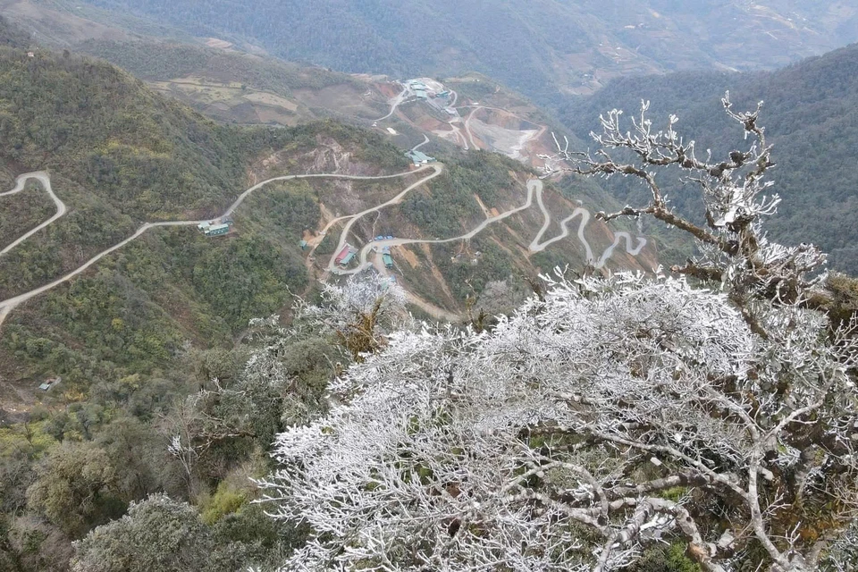 Do ảnh hưởng của không khí lạnh khiến nhiệt độ giảm sâu, tại các đỉnh núi cao của huyện Mù Cang Chải (Yên Bái) xuất hiện băng giá vào đêm ngày 26/1. (Ảnh: TTXVN phát)