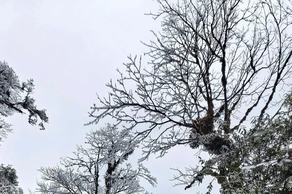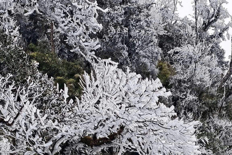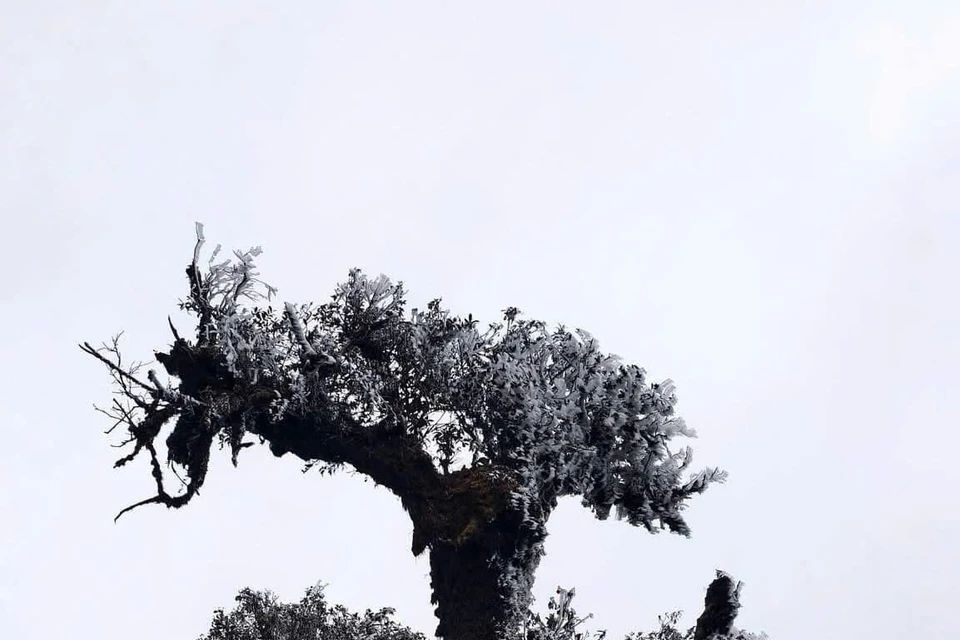 Băng giá xuất hiện tại các đỉnh Trống Páo Sang, Khau Phạ và Kháu Nha thuộc xã La Pán Tẩn; đỉnh Lùng Cúng thuộc xã Nậm Có (huyện Mù Cang Chải, Yên Bái). (Ảnh: TTXVN phát)