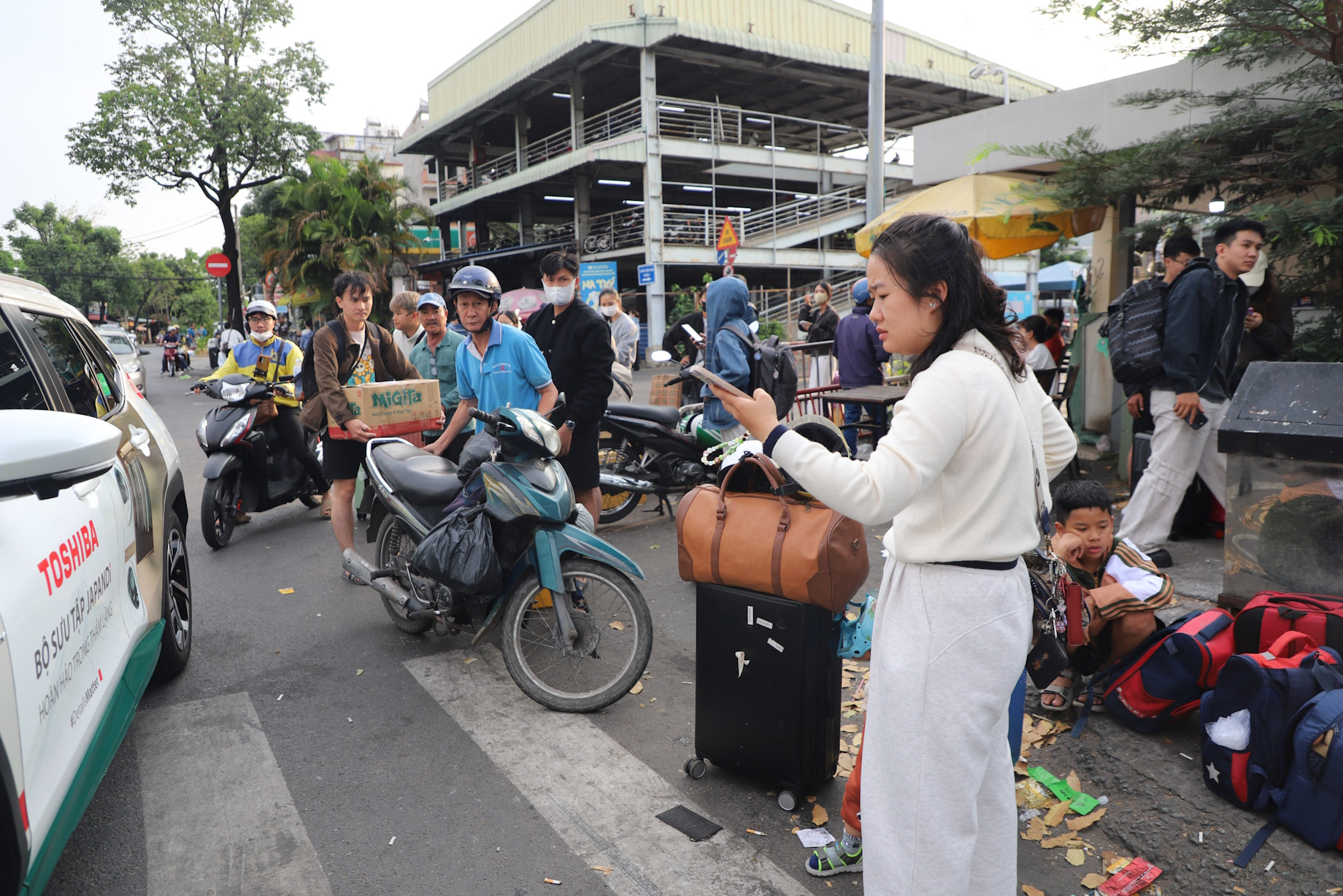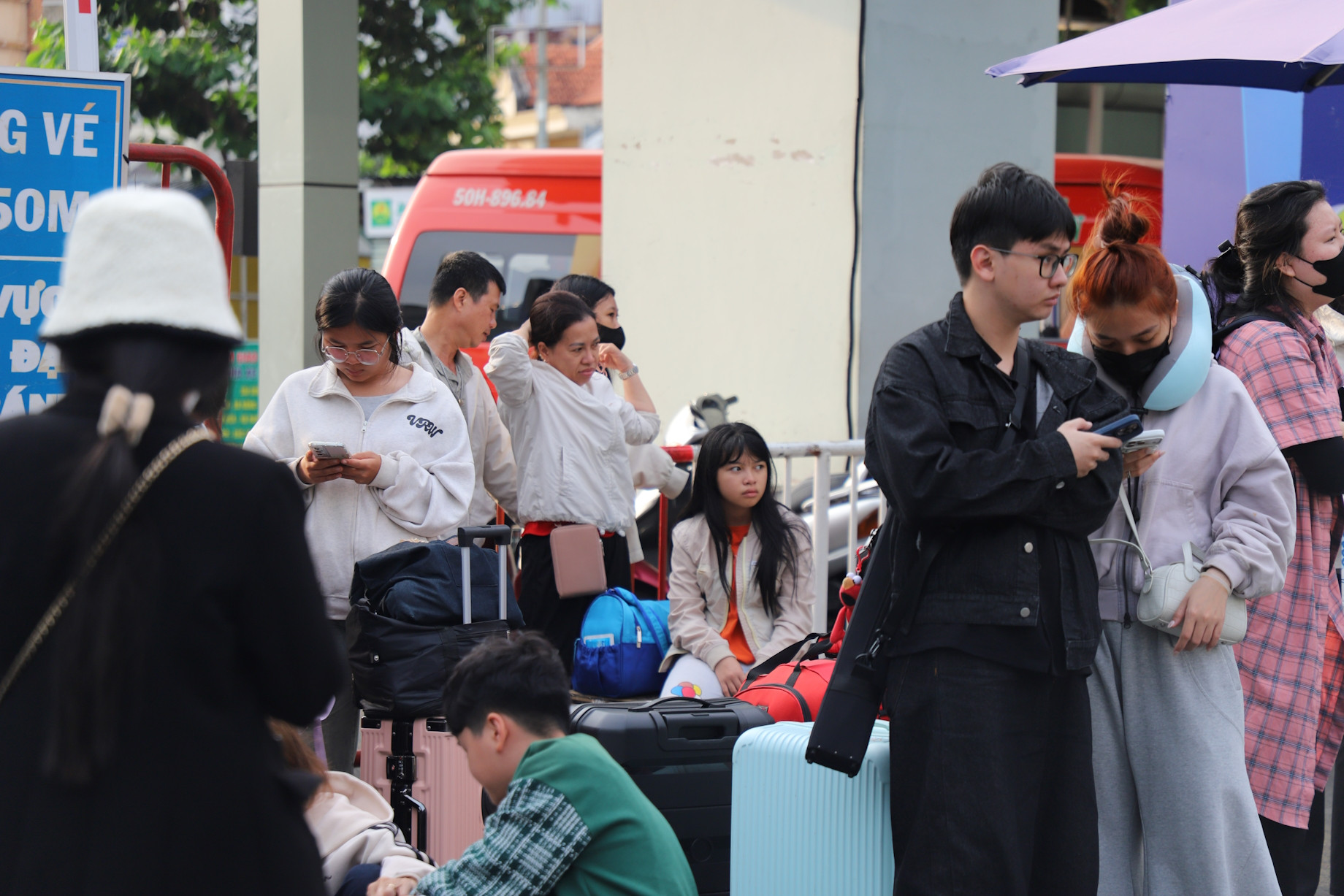 Tại khu vực Bến xe Miền Đông, nhiều hành khách từ các tỉnh Tây Nguyên tất bật liên lạc với người thân hoặc đặt xe qua các ứng dụng công nghệ để nhanh chóng trở về nhà, chuẩn bị cho ngày làm việc đầu tiên sau kỳ nghỉ Tết Bính Ngọ.