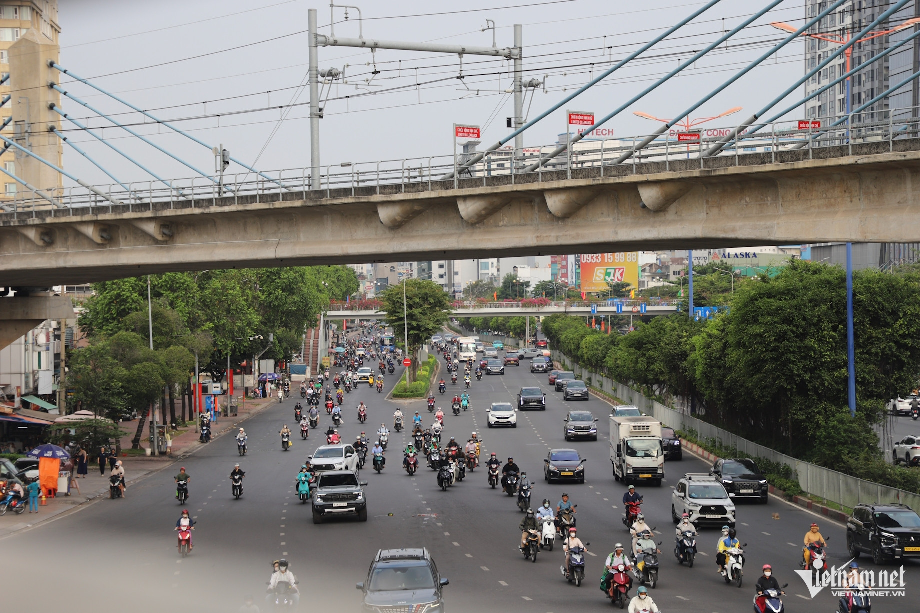 Hình ảnh Cầu Sài Gòn nối liền trục Võ Nguyên Giáp và Điện Biên Phủ cho thấy lưu lượng phương tiện ổn định ở cả hai chiều, các xe di chuyển thông suốt, không ghi nhận tình trạng ùn tắc kéo dài.