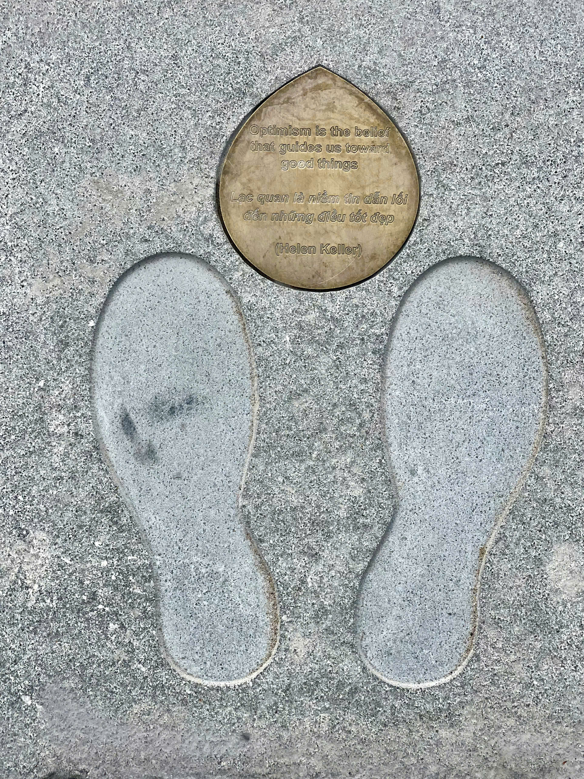 Trên những bậc cấp có in hình những dấu chân đá, biểu trưng cho hành trình sống và ký ức còn lại. Ảnh HOÀNG HÙNG