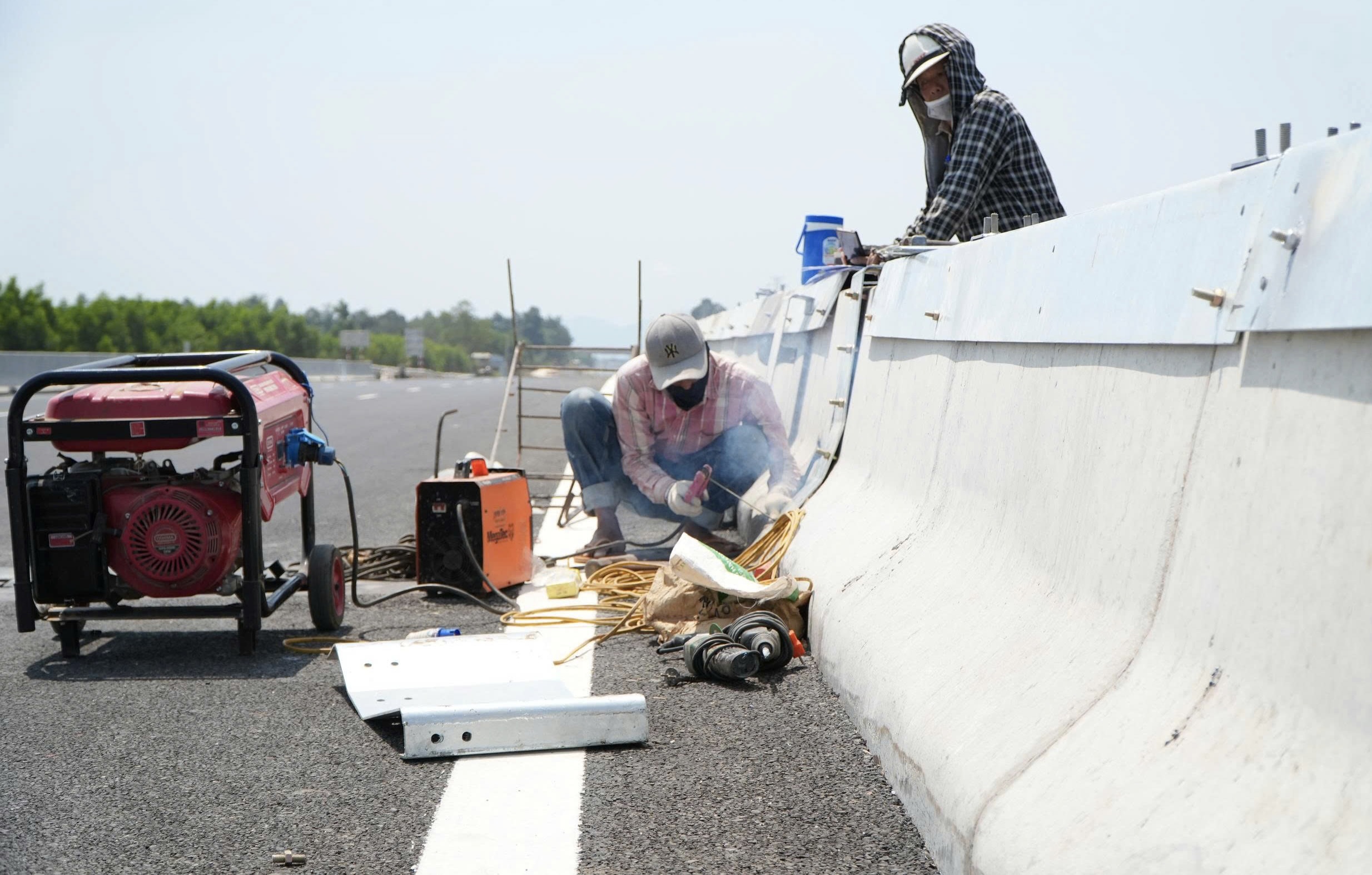 Trên công trường, công nhân đang tăng tốc hoàn thiện các hạng mục đảm bảo an toàn như hộ lan, dải chống chói, biển báo… nhằm bảo đảm các điều kiện an toàn khi đưa vào thông xe.