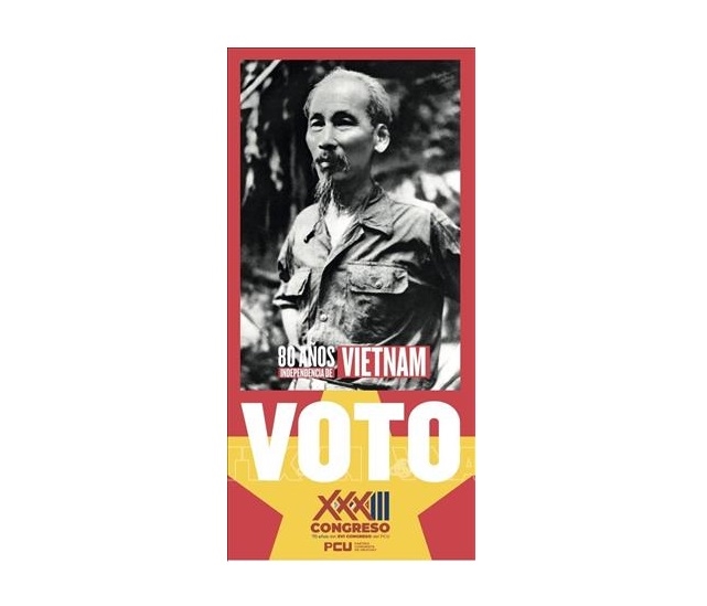 Hình ảnh Chủ tịch Hồ Chí Minh trong phiếu bầu Đại hội Đảng Cộng sản Uruguay lần thứ 33, với dòng chữ "80 năm Quốc khánh Việt Nam. Đại hội Đảng Cộng sản Uruguay (PCU) lần thứ 33".